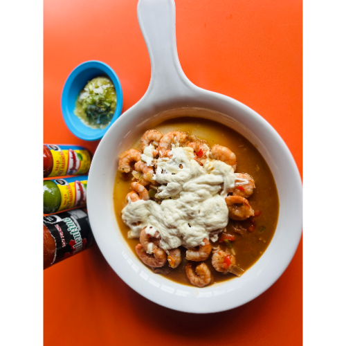 200 g de camarones, morrón, cebolla, tocino, gratinado con queso y acompañado con tortillas de harina y guacamole