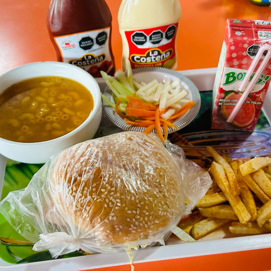 Incluye entrada, plato fuerte, papa francesa, ensalada, jugo y postre