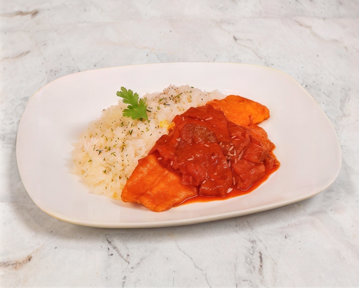 BAÑADO EN SALSA DIABLA CON ARROZ Y ENSALADA
