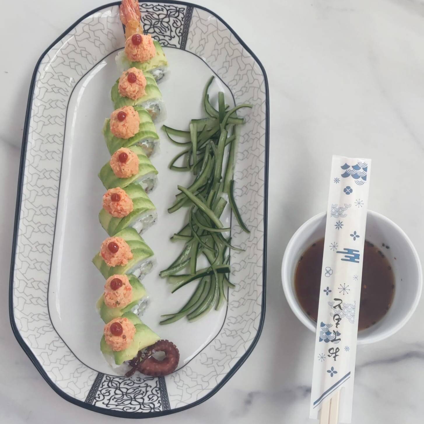 (AGUACATE ENVUELTO CON ATUN FRESCO Y SURIMI, BAÑADOS EN ADEREZO DE CILANTRO Y ACEITE DEGENJOBRE