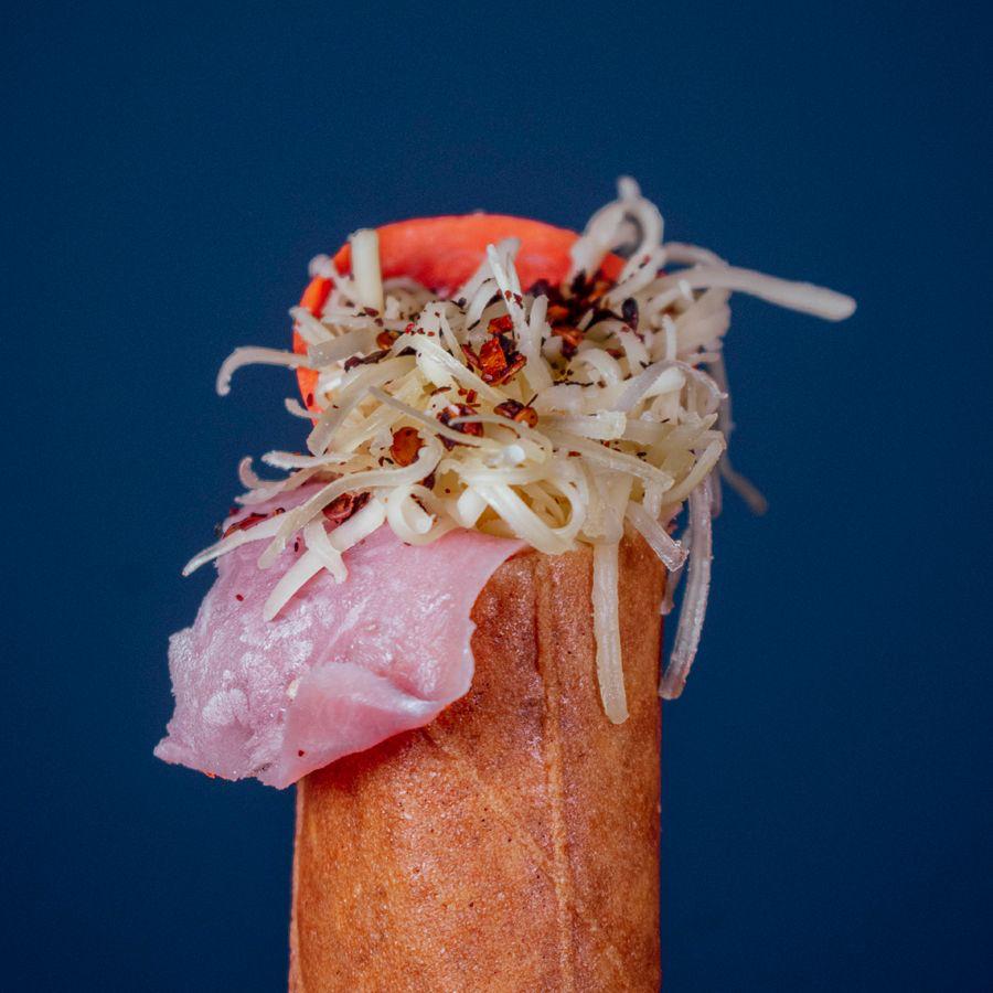 Jamón, pepperoni, queso de bola y hojuelas de chile.