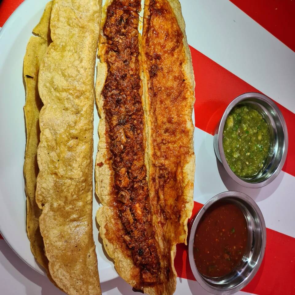 Tortilla azul hecha a mano de 50 cm, con 200gr de Suadero de Pecho y Barriga. La verdura, salsa y limones van aparte.