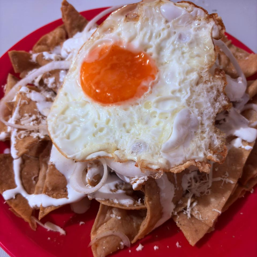 Chilaquiles 350g con huevo revuelto o estrellado, salsa, crema, cebolla.