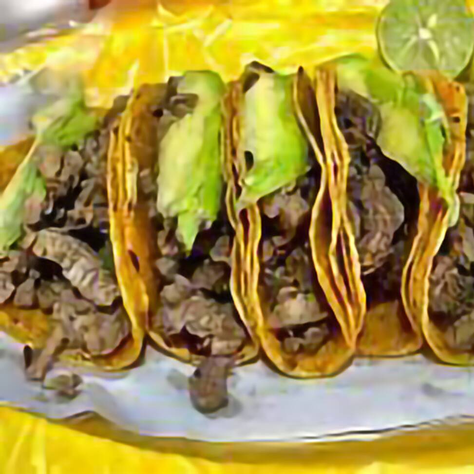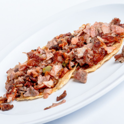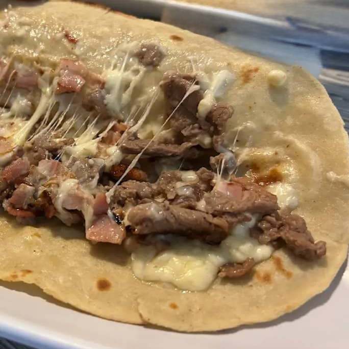 Tortilla azul hecha a mano de 25 cm, con 100gr de bistec con tocino jugoso. La verdura, salsa y limones van aparte.
