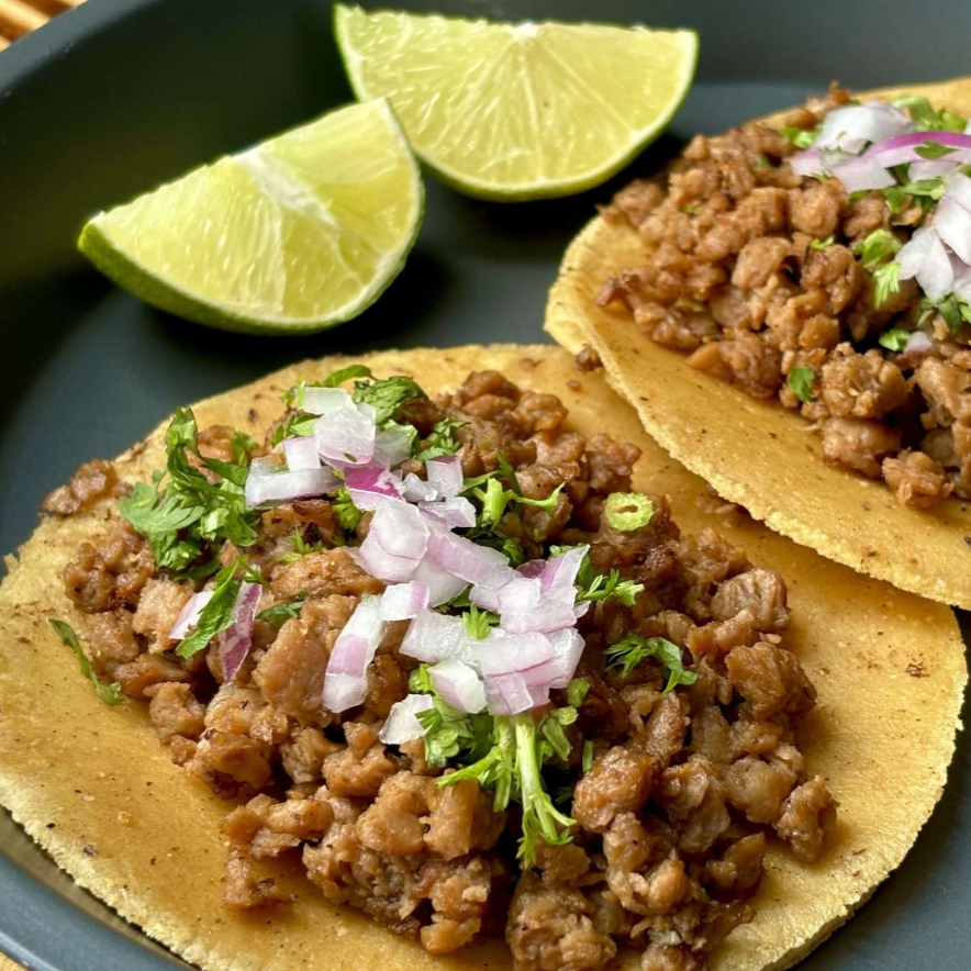 Tortilla azul hecha a mano de 25 cm, con 100gr de suadero de Pecho y Barriga. la verdura, salsa y limones van aparte.