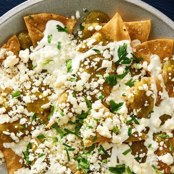 Chilaquiles 350g con proteina a elegir, salsa, crema, cebolla.