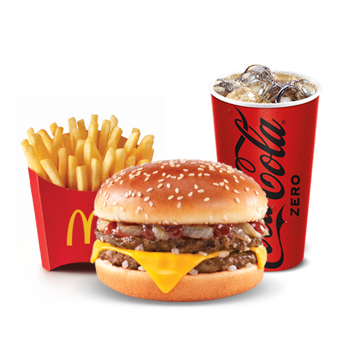 Hamburguesa con 2 carnes de res, queso americano, cebolla, pepinillos, cátsup y mostaza. Incluye papas y refresco de 21oz.