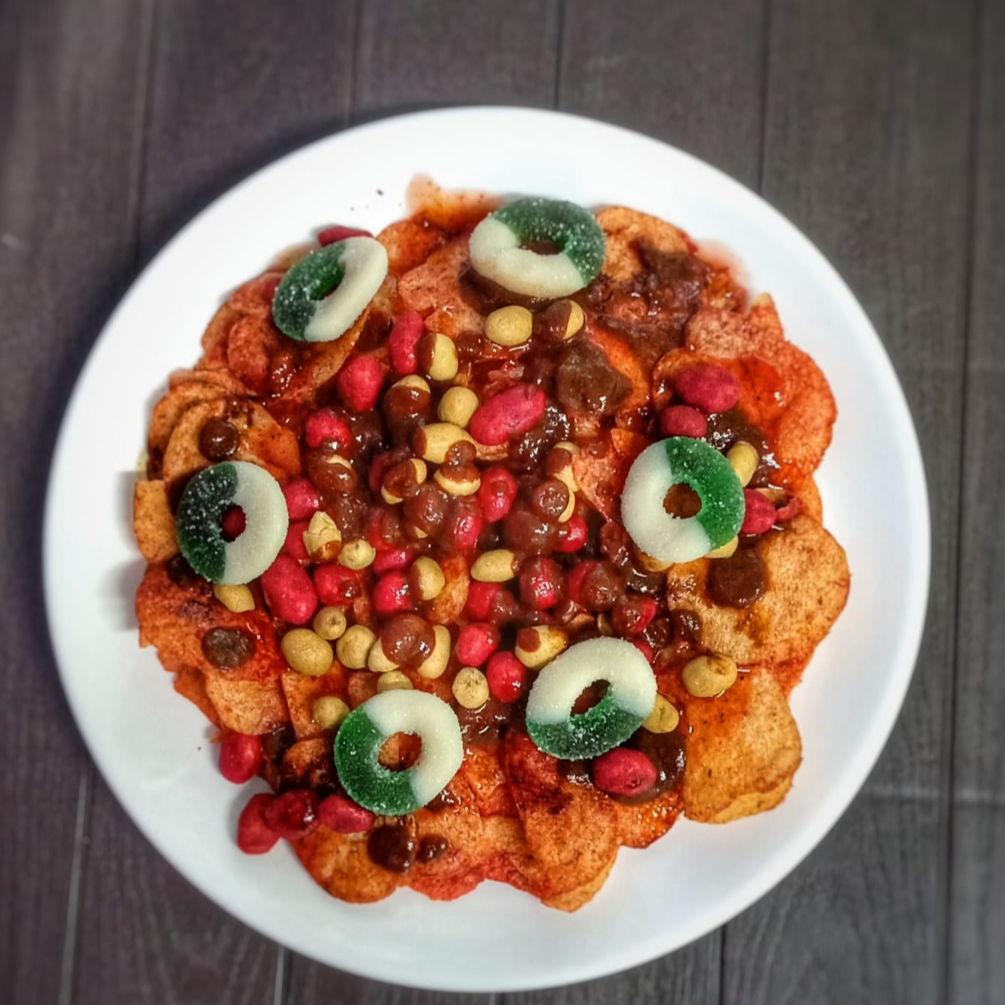 papas fritas con diferentes tipos de salsas topping de cacahuates japoneses, cacahuates hot nuts, gomitas. salsa inglesa y salsa maggi.