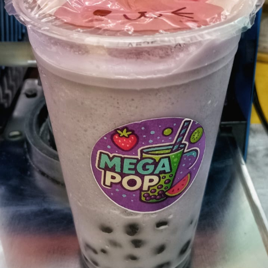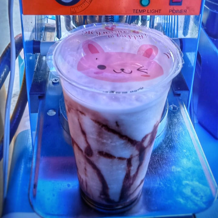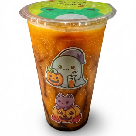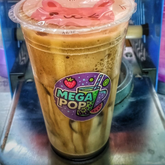 cafe espumoso "secreto de la casa" con hielo, leche preparada y perlas de tapioca