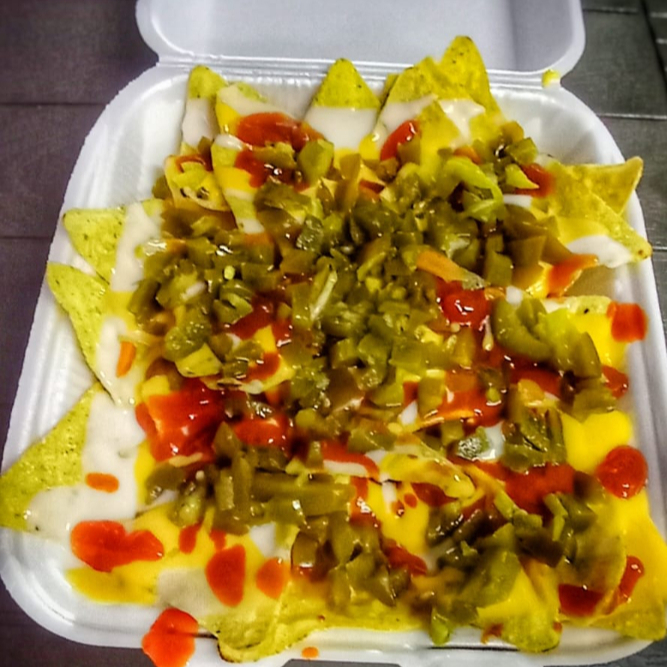 frituras de maíz estilo totopos, acompañados de crema, queso, salsa catsup, salsa picante y chiles jalapeños.
