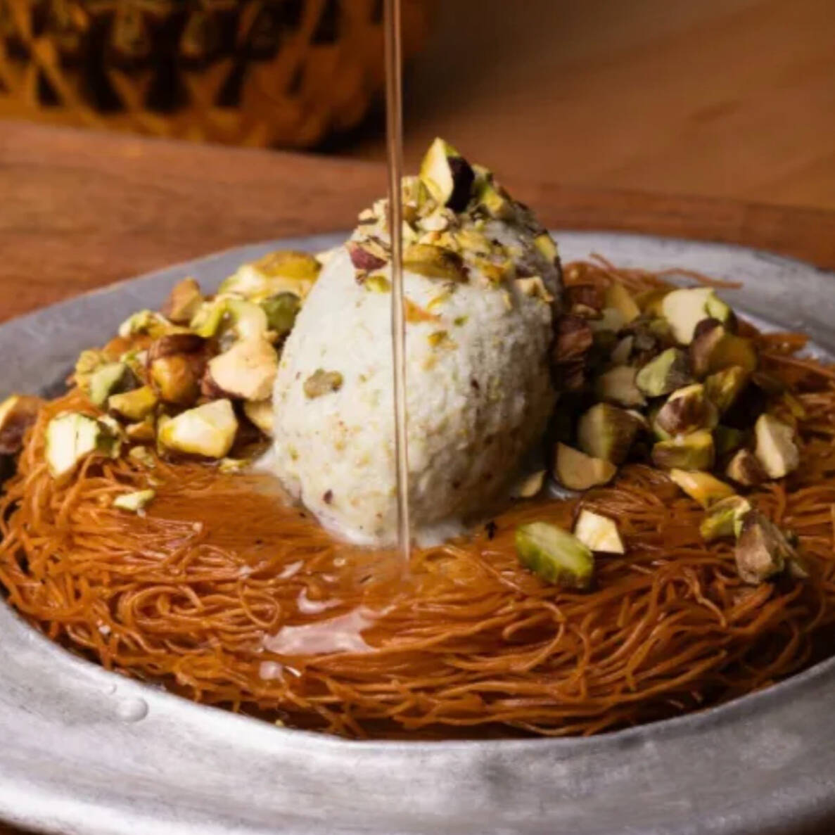 Pasta kataiffi con jarabe de rosas y helado con pistache