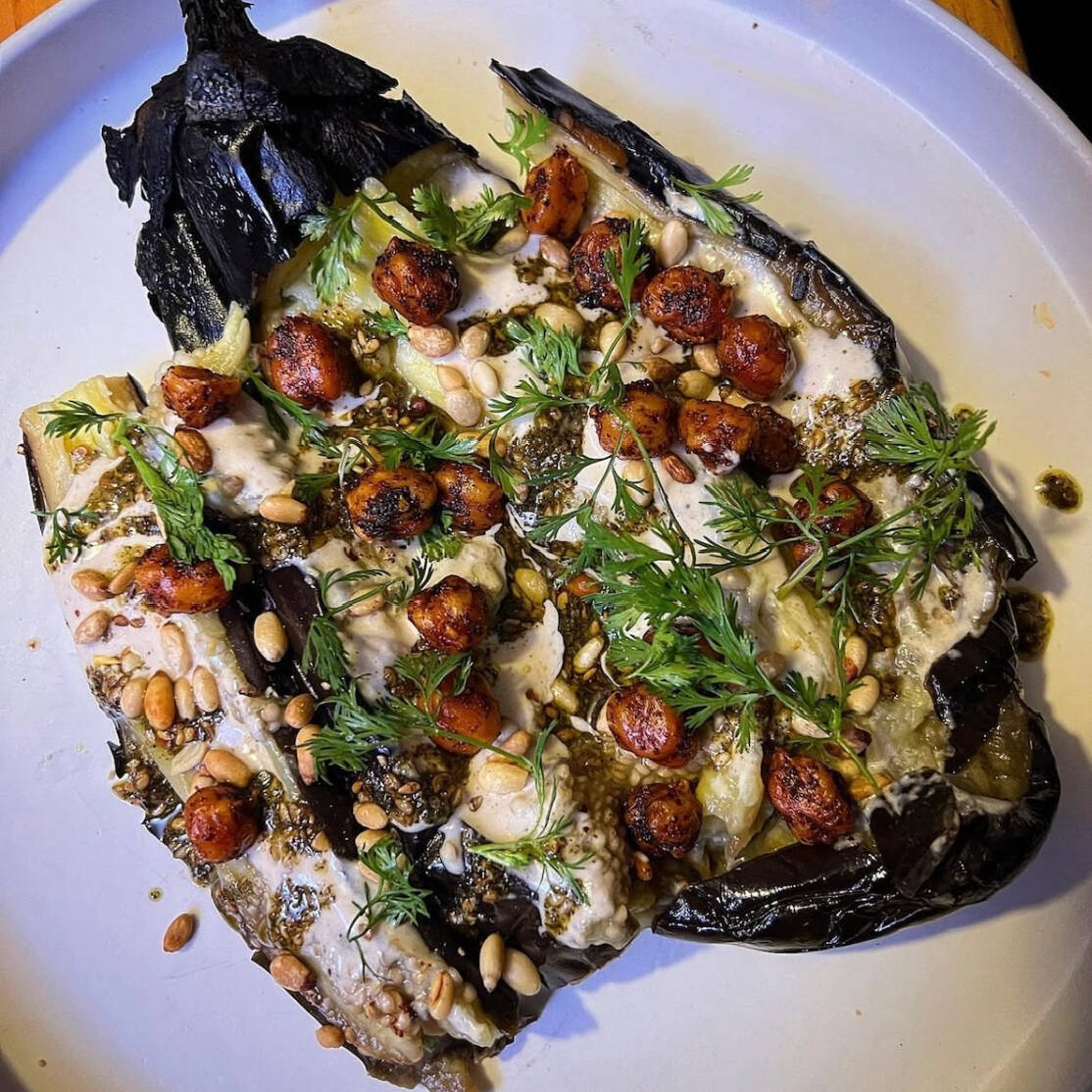Horneado con calabaza de costilla, acompañado de jitomate, comino, chile serrano en aceite de oliva y mantequilla de tehina