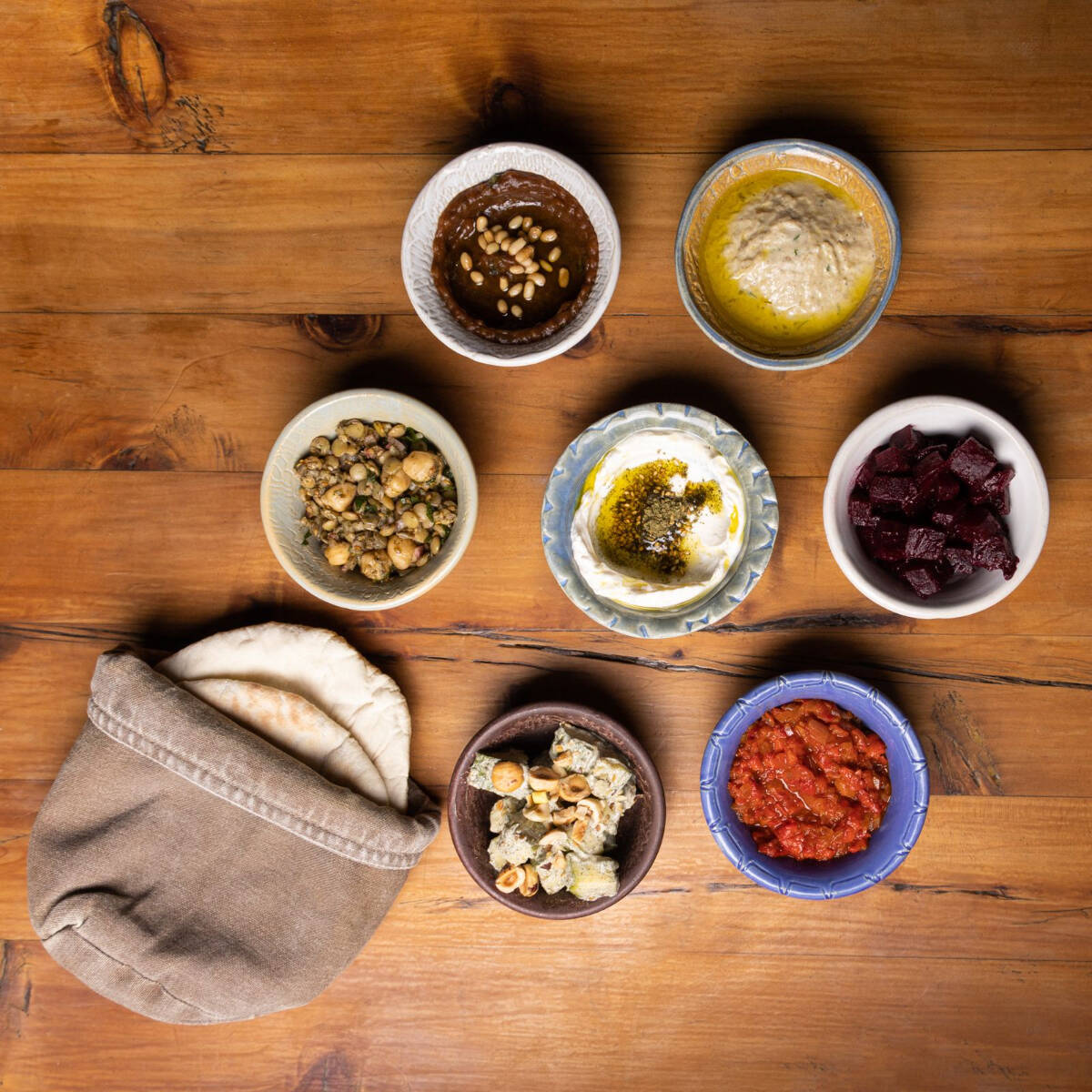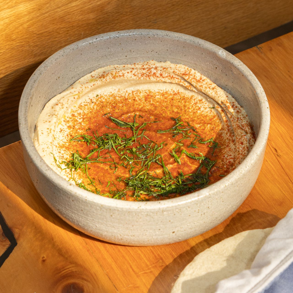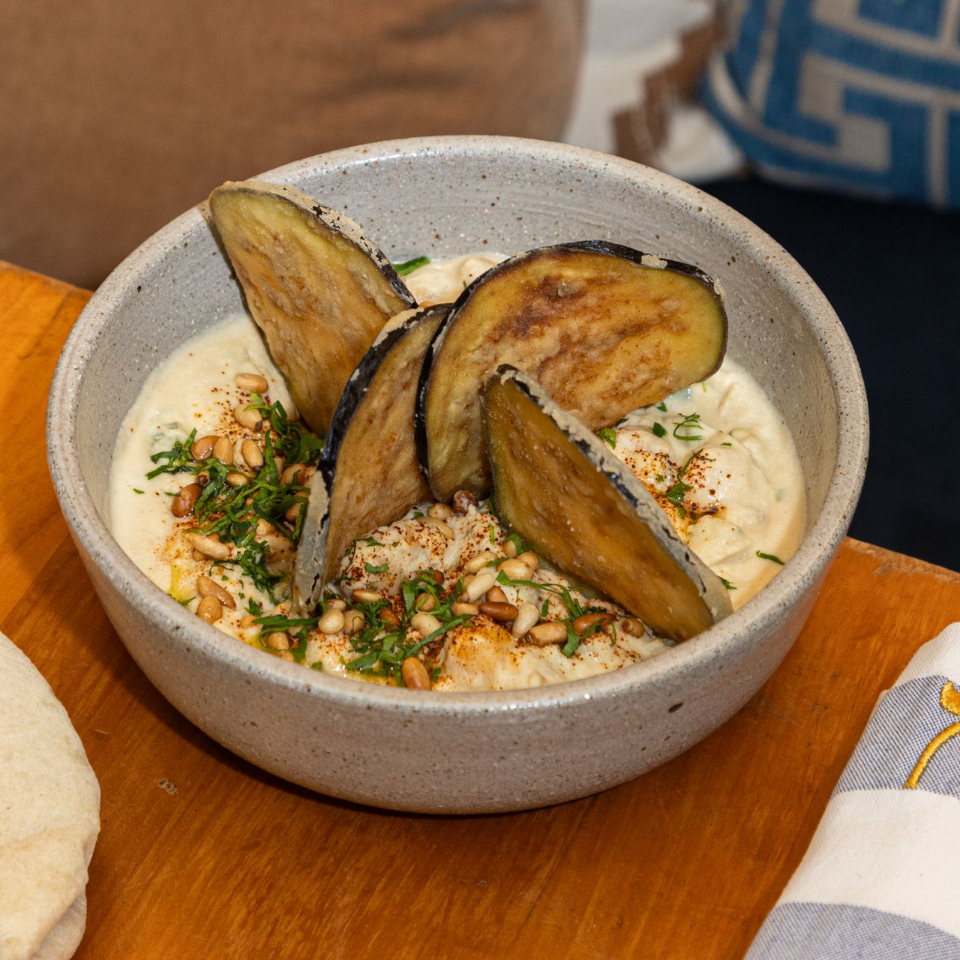 Tehina, vinagreta de za'atar, piñones, garbanzo frito y cilantro