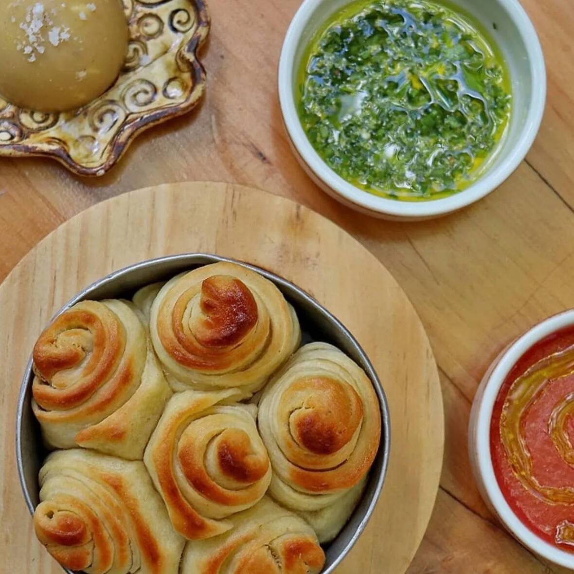 Empanadas de hojaldre rellenas de espinaca y queso feta, labneh hecho en casa, za`tar y aceite de oliva