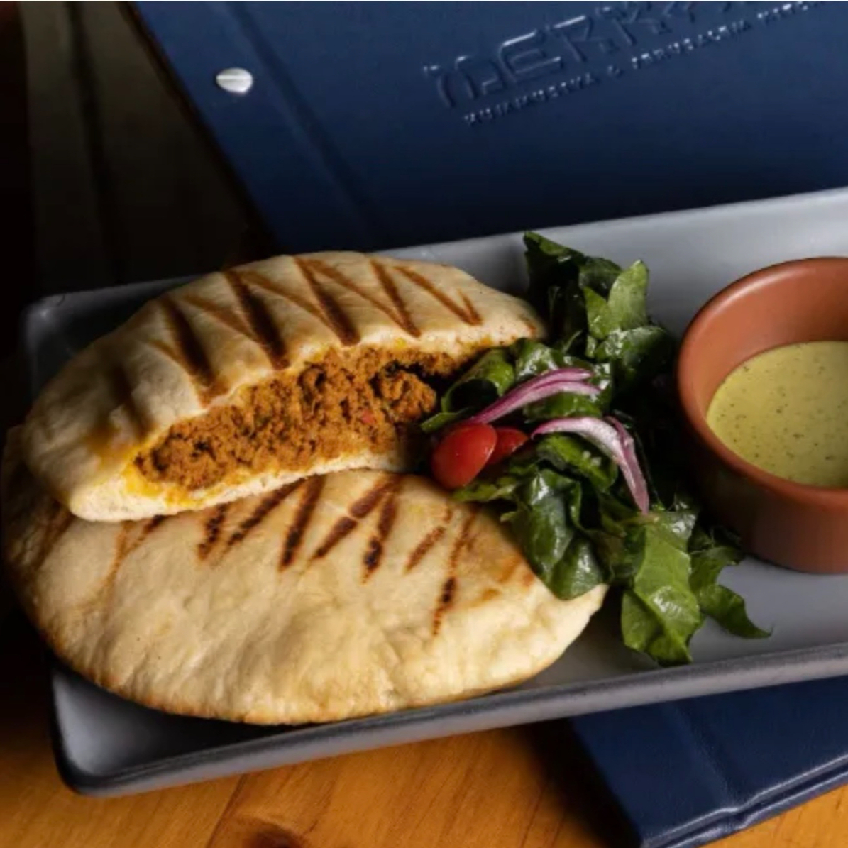 Pan pita relleno de carnede res y cordero con especias, thina verde con menta ,yerbabuena y chile serrano.