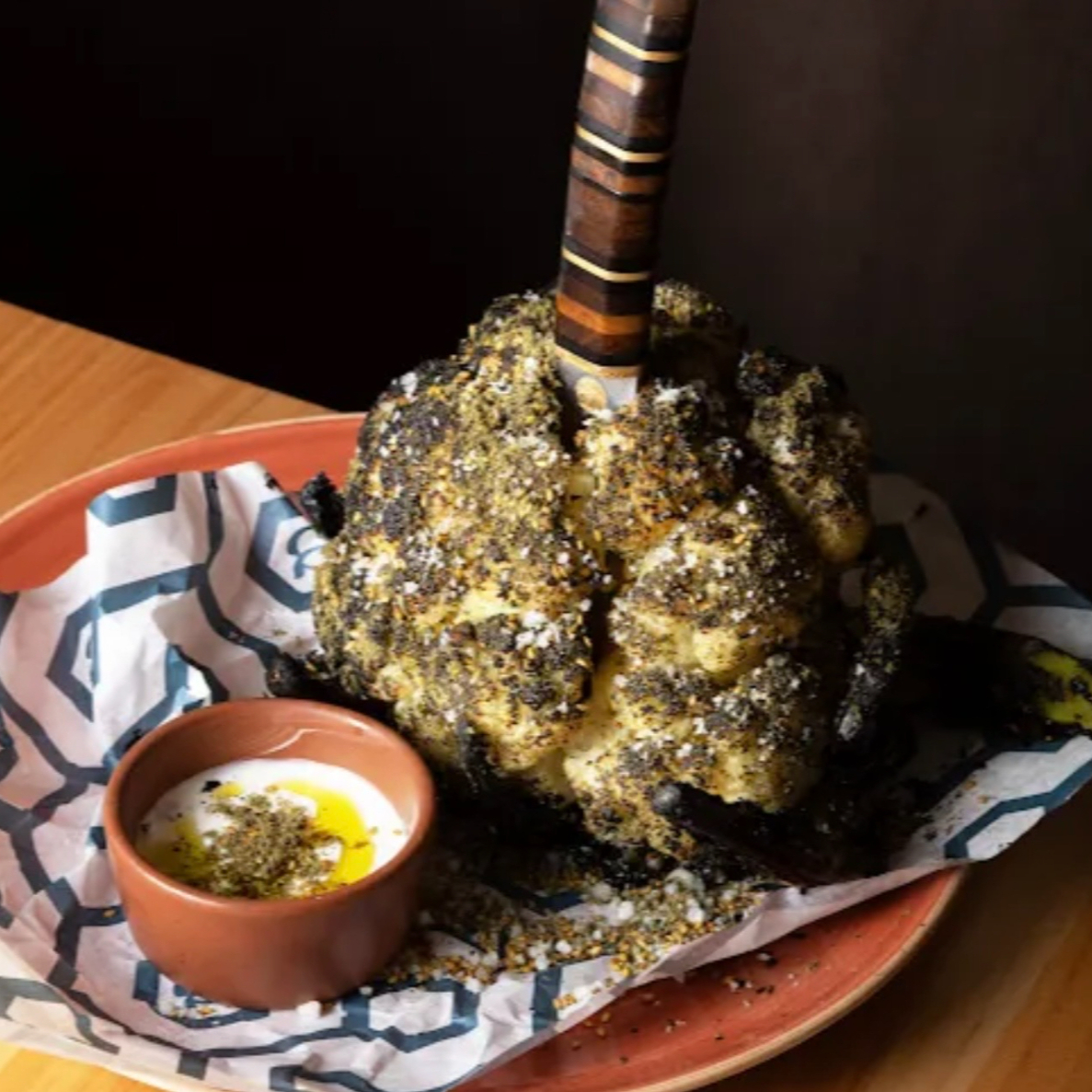 Marinado con harissa y acompañado de hojas fritas de alcachofa y labneh