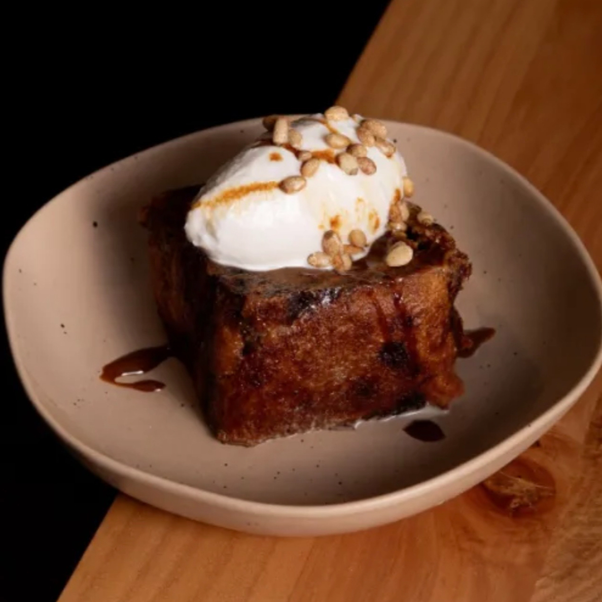 de chocolate, con helado, miel de datiles y piñones.