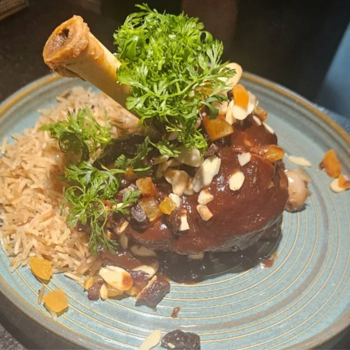 Arroz persa a la mantequilla, salsa de datiles, pasas y chabacano con frutos secos y cilantrillo