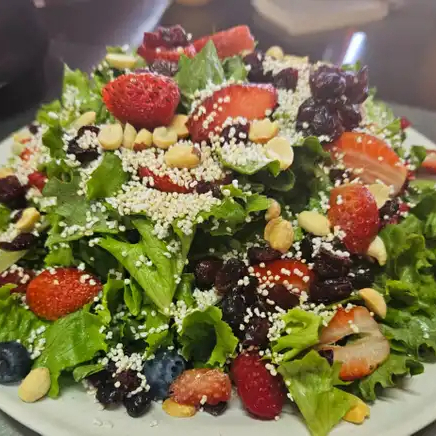 Lechuga, fresa, frambuesa, blueberry, arándanos, amaranto, cacahuate, aderezo y tamaño a elegir.