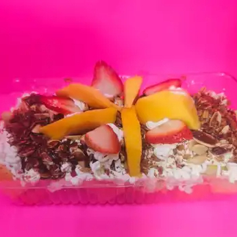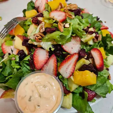 Lechuga, kiwi, uva, fresa, almendra fileteada, yogurt natural, miel, aderezo y tamaño a elegir.