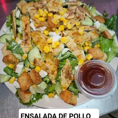 Lechuga, pepino, elote, pollo asado, crutones, queso parmesano, panela, aderezo y tamaño a elegir.