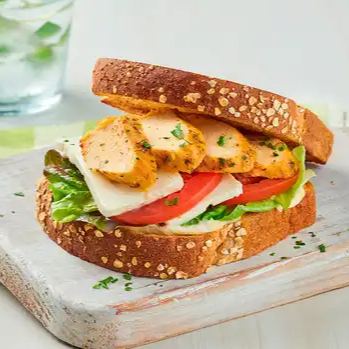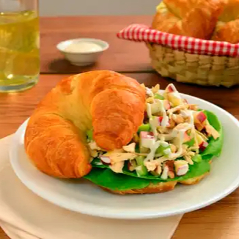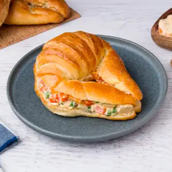Pan cuernito con pollo, lechuga, jitomate, cebolla, queso panela y manchego en rajas.