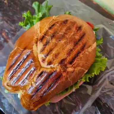 Pan cuernito con jamón, lechuga, jitomate, cebolla, queso panela y manchego en rajas.