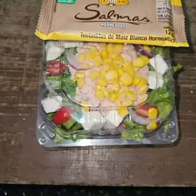 Lechuga, espinaca, cebolla morada, atún, jitomate cherry, elote, queso panela, aderezo y tamaño a elegir.