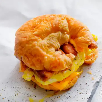 Pan cuernito con salchicha, lechuga, jitomate, cebolla, queso panela y manchego en rajas.