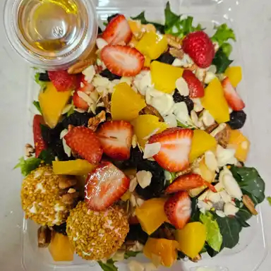 Lechuga, espinaca, durazno, fresa, melón, pasas, almendra, nuez, queso Philadelphia, ajonjolí, aderezo y tamaño a elegir.