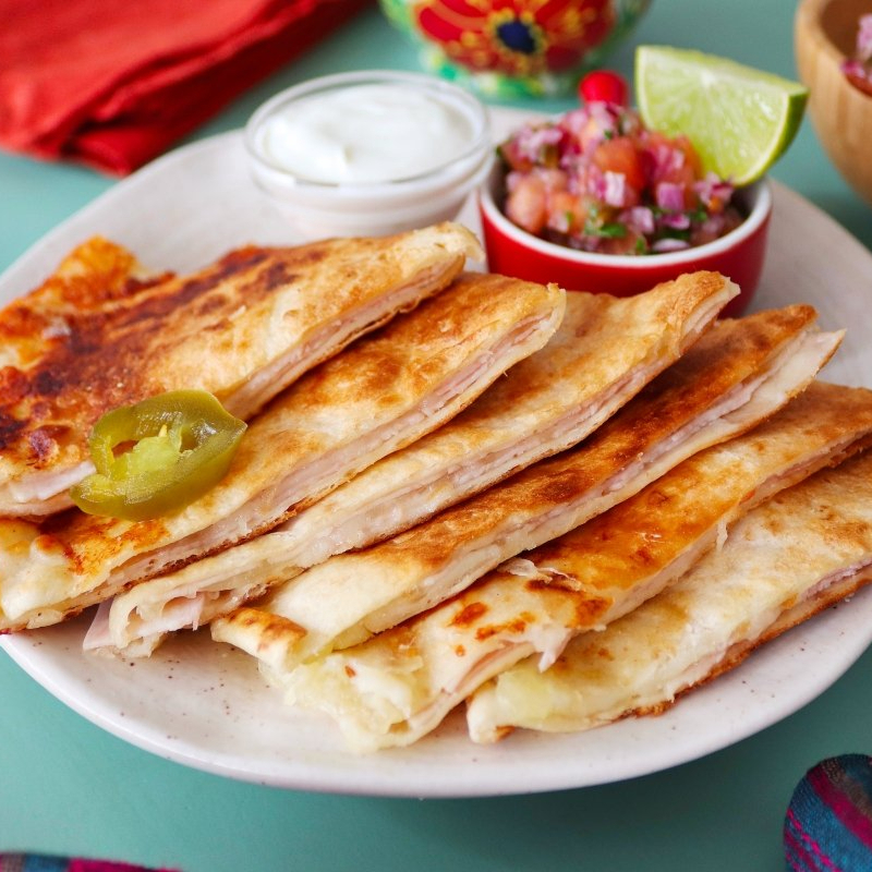 Echas con tortilla de harina queso y jamón acompañada con salsa mexicana