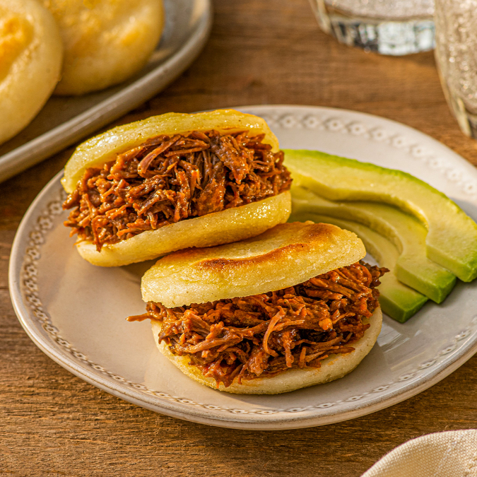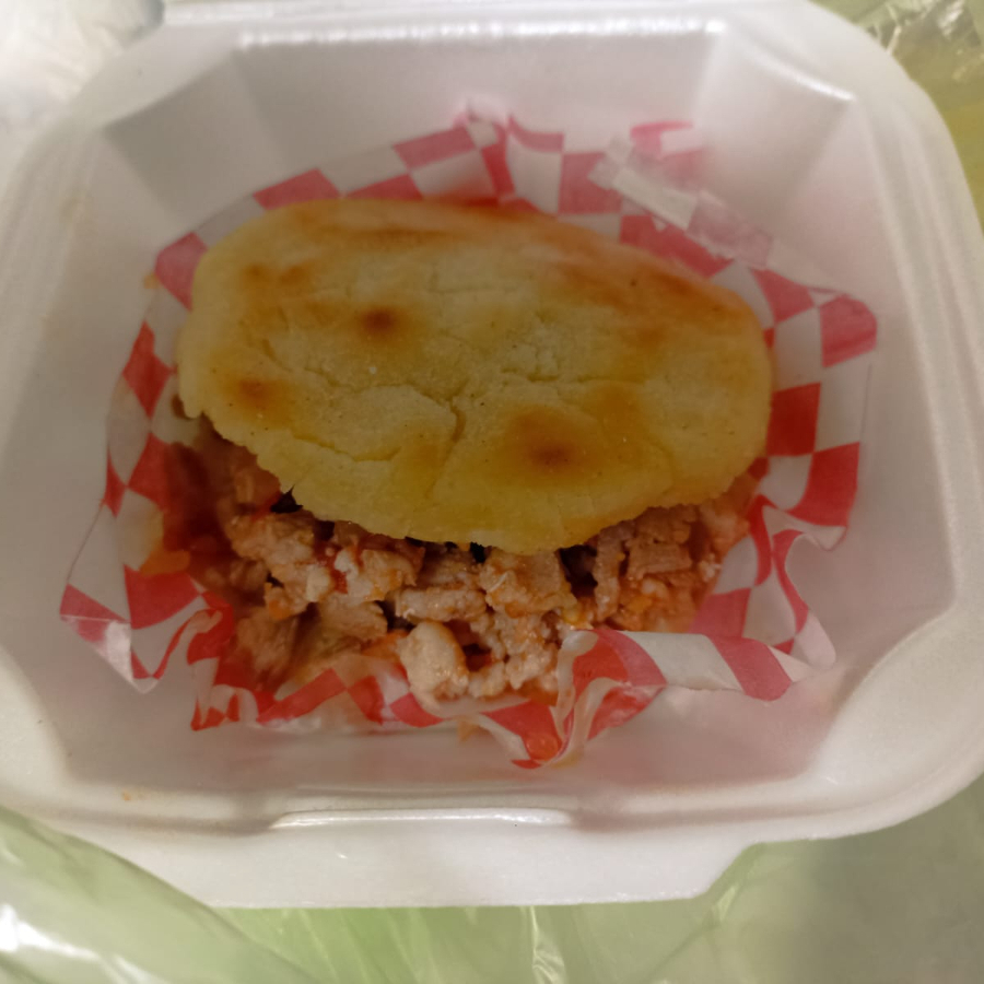 Deliciosa arepa rellena de pechuga de pollo deshebrado.
