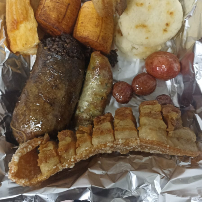 Mezcla de chorizo, morcilla, chicharrón, yuca, plátano, papa y arepa.