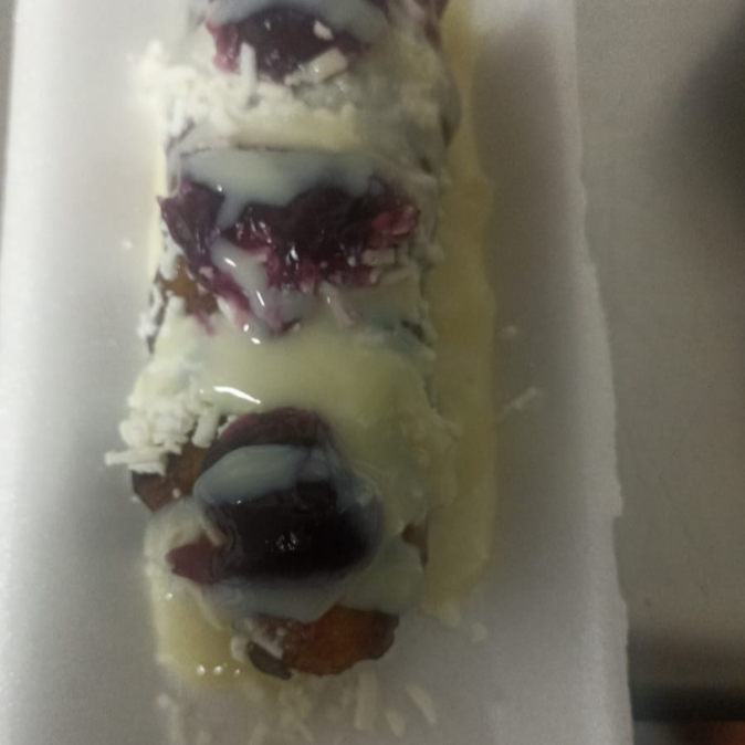 Delicioso plátano relleno de queso y bocadillo bañado en leche condensada, mermelada y queso