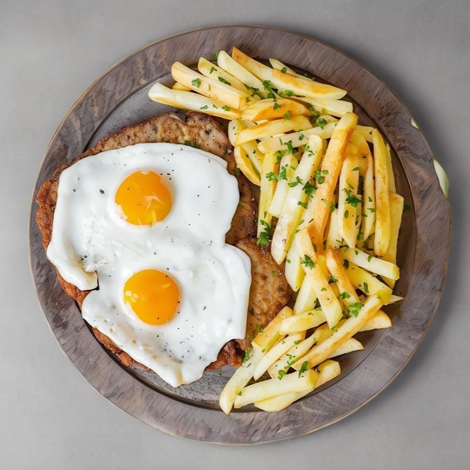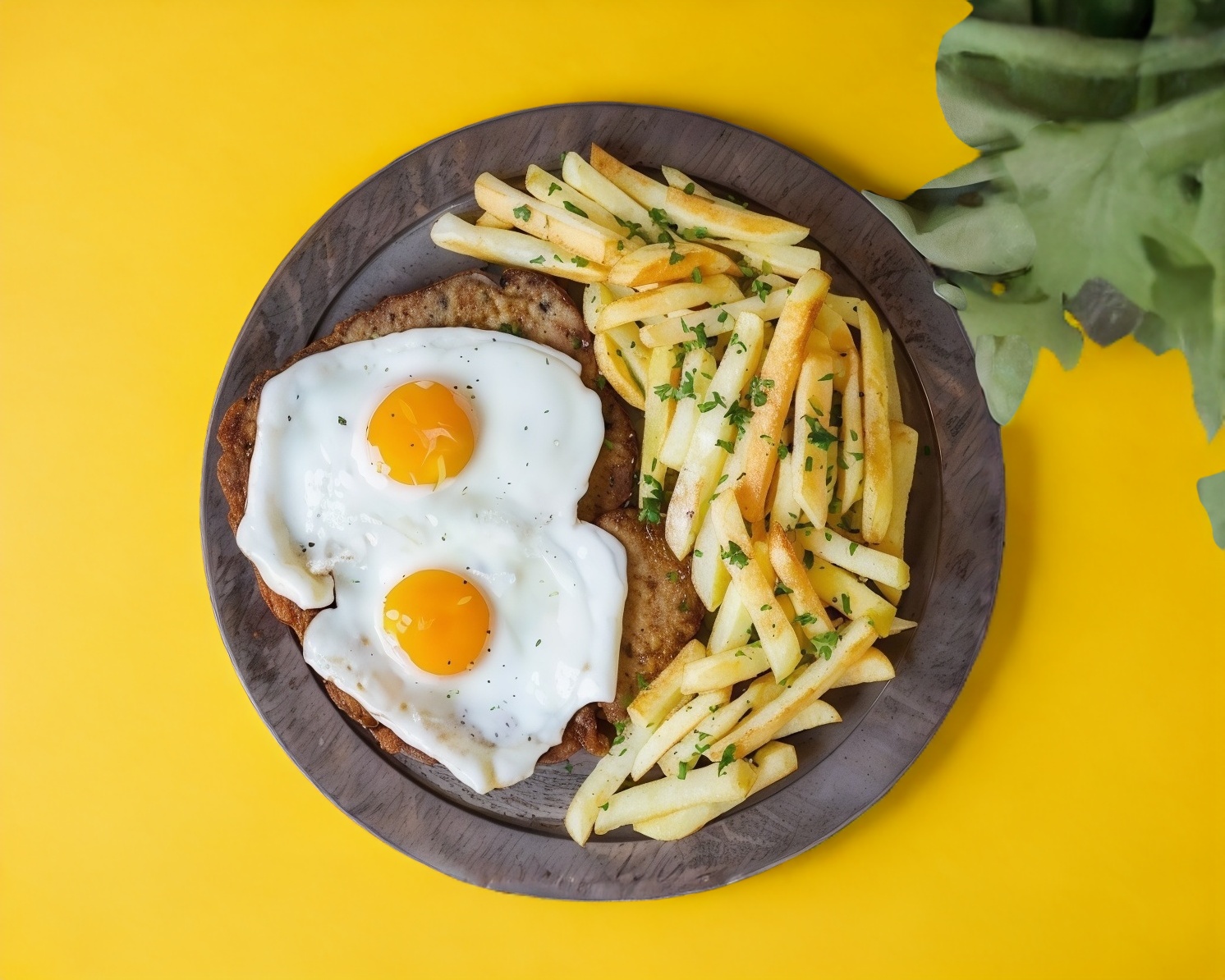Milanesa de pollo con nuestra receta única de empanizado que te encantará. Con 2 huevos estrellados encima.