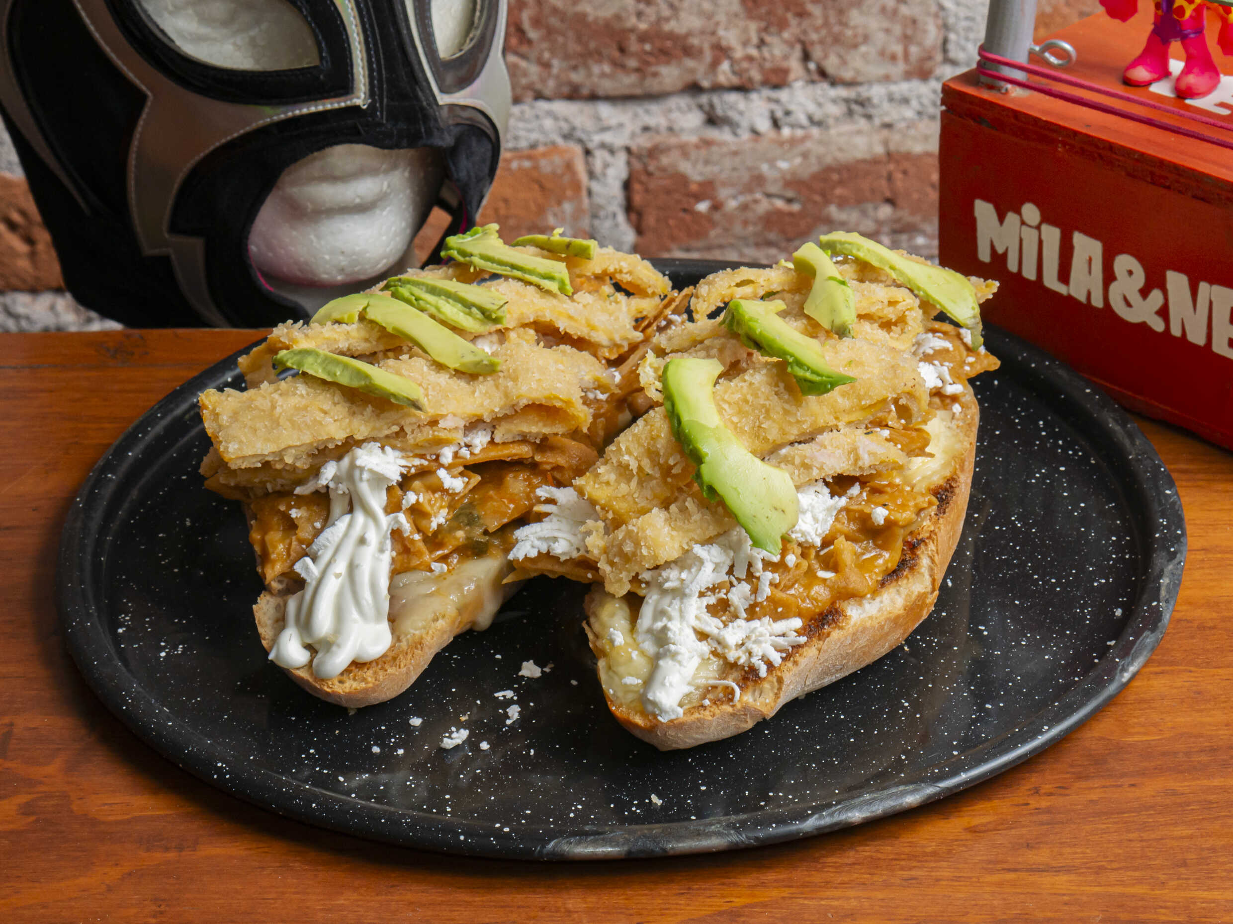 Torta acompañada de tú proteína, frijolitos, aderezo, jitomate, aguacate, cebolla morada con habanero.
