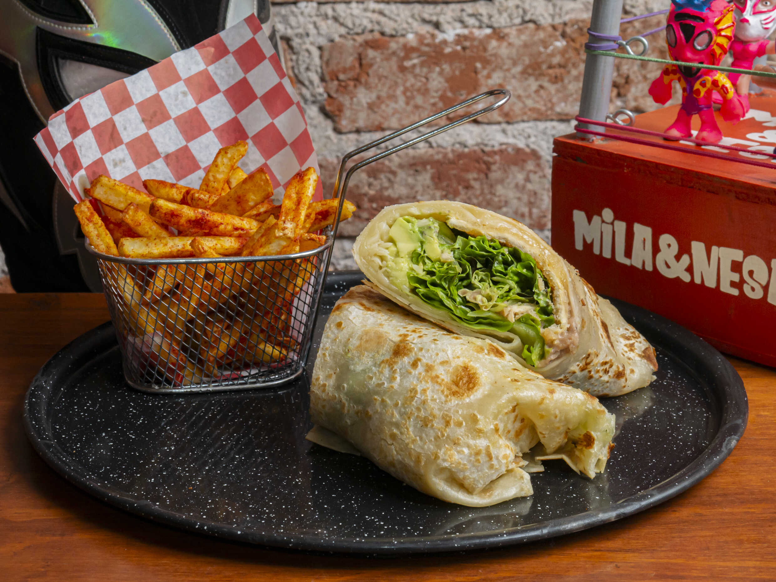 Burrito acompañado de tú proteína favorita, acompañado de frijoles, queso, lechuga y aguacate