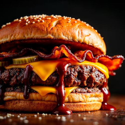 Te gusta el BBQ tocino y aros de cebolla!!!! Esta el la indicada: Burger de doble carne 120gr c/u de 100% carne de res artesanal (no congelada) con queso, tocino y aros de cebolla.
