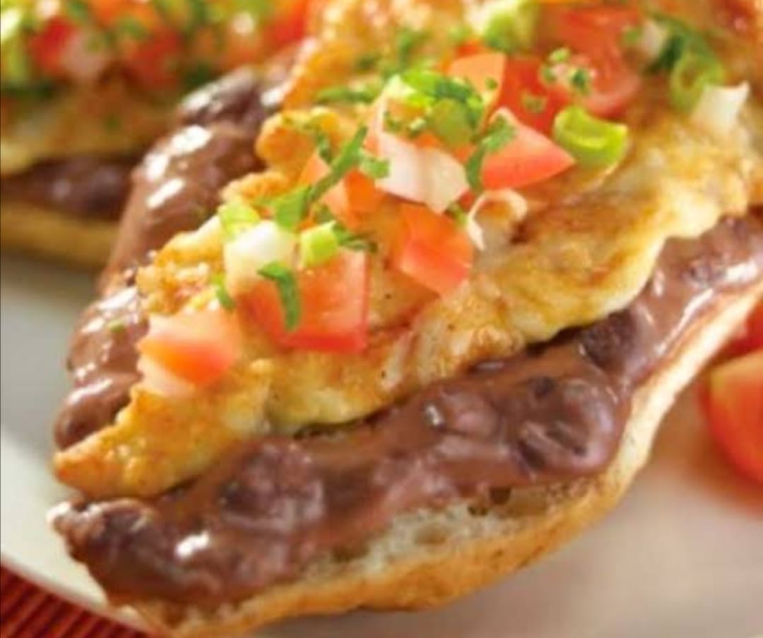 Ricos molletes con frijoles, gratinados con queso gouda y Tocino acompañados con pico de gallo.