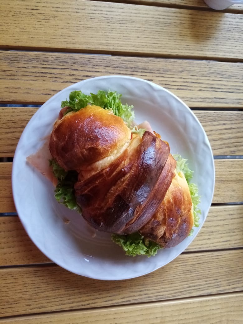 Delicioso cuernito con mayonesa, queso gouda, queso amarillo y jamón, acompañado con lechuga, jitomate y aguacate.