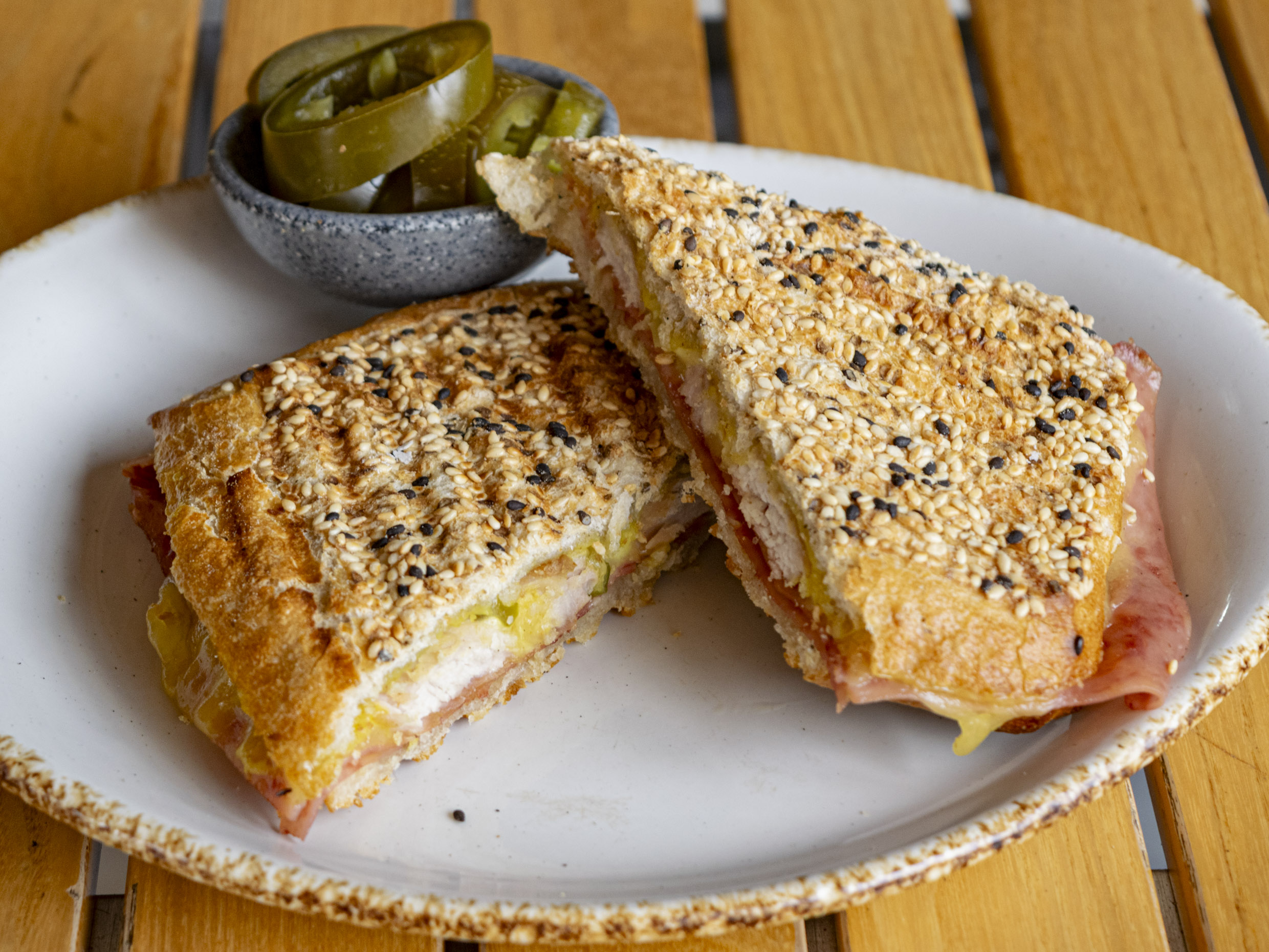 Deliciosa chapata con mayonesa, jamón de pavo, queso panela, queso gouda, queso amarillo, jitomate, aguacate y lechuga.