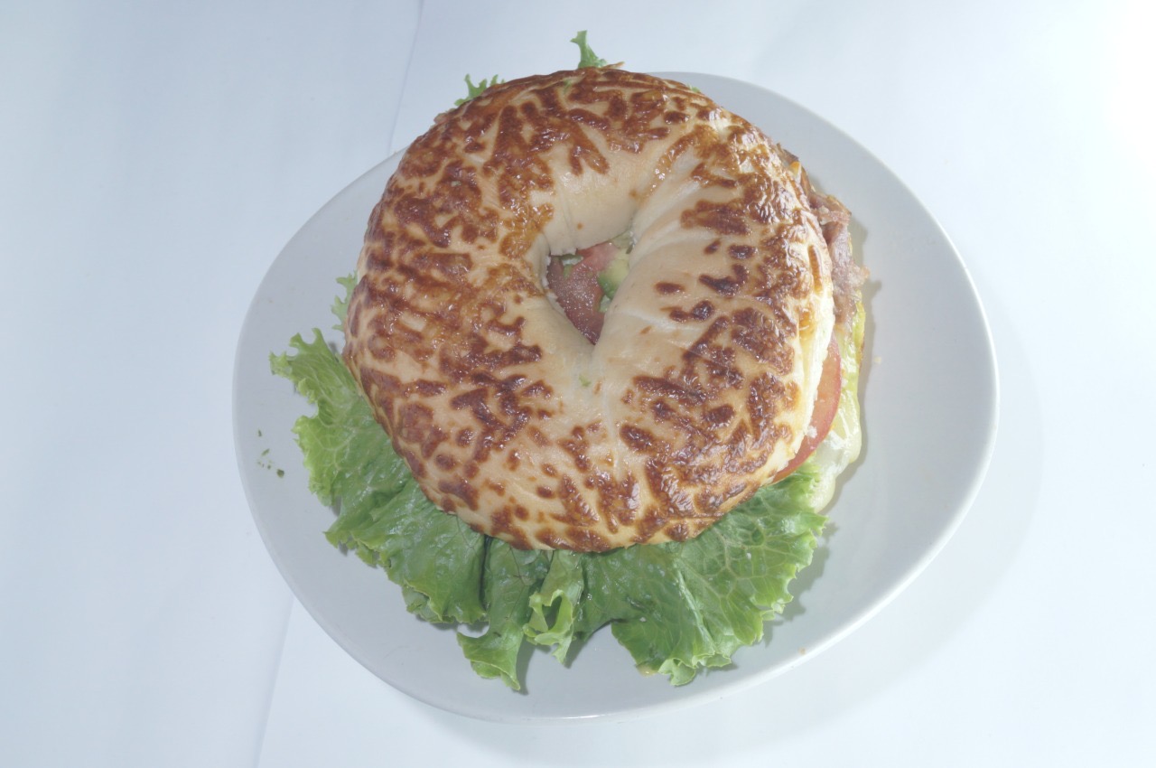 Exquisito bagel de pepperoni acompañado con queso amarillo, queso gouda, queso amarillo, aderezo con salsa italiana de tomate y mayonesa además de lechuga, jitomate y aguacate.