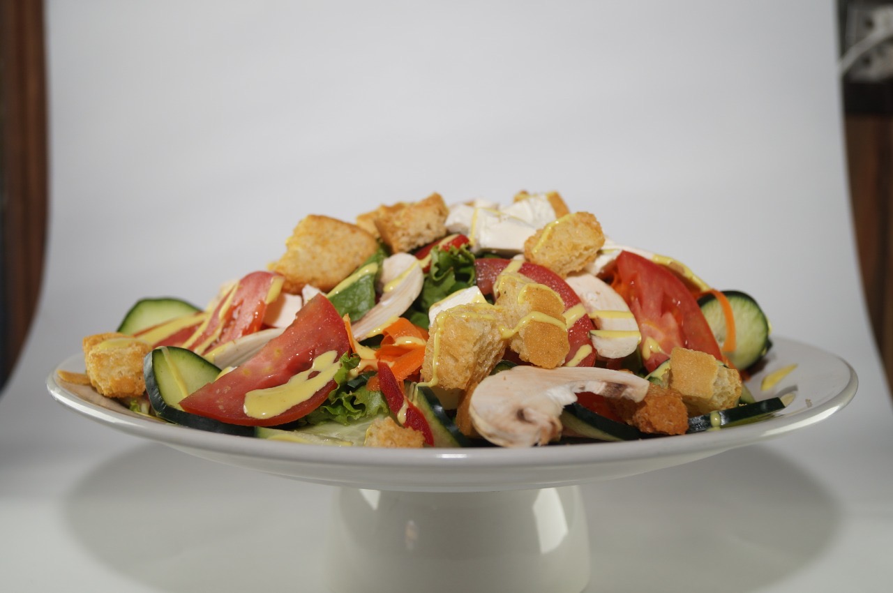 Lechuga acompañada de queso de cabra, pepino, espinaca, aceitunas negras, jitomate, champiñón, grano de elote, con vinagreta, crotones y ajonjolí.