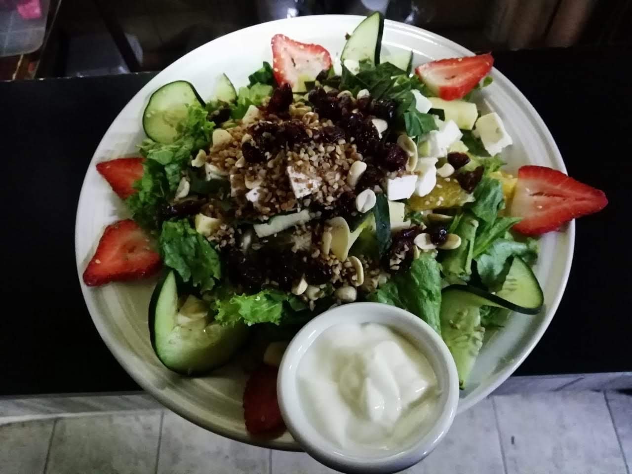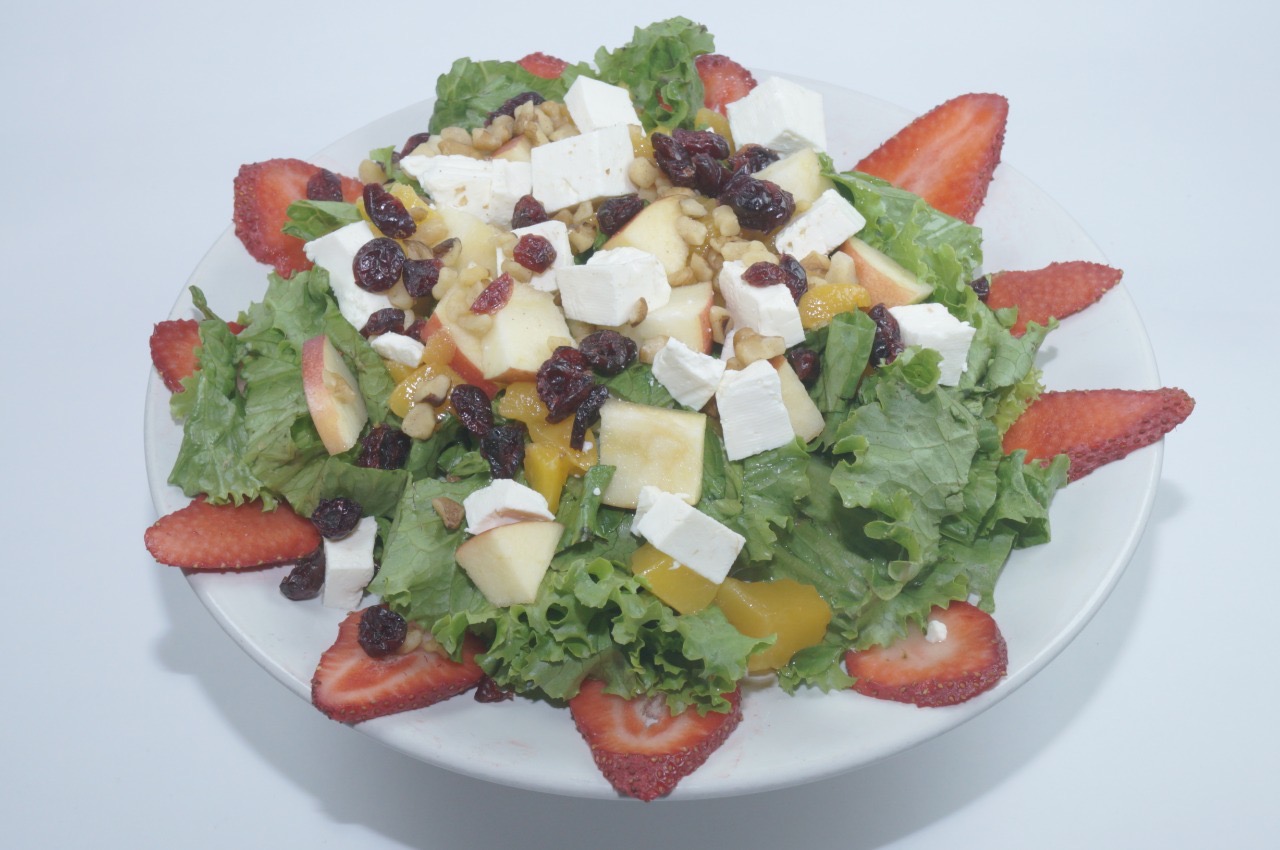 Fresca lechuga italiana servida con fresa, manzana, durazno, queso panela, nuez, almendra, arándanos,nuez, con aderezo dulce o yogurt.