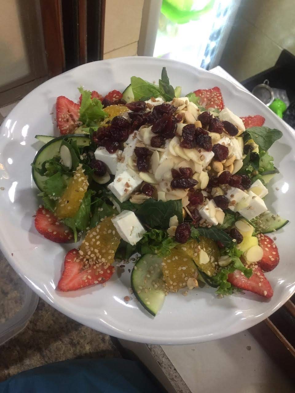 Esquisita mezcla de lechugas y espinacas con manzana, fresa, naranja, pepino, arándanos deshidratados y queso panela. Acompañada de deliciosas semillas como nuez, cacahuate, ajonjolí, almendra y aderezo yogur.