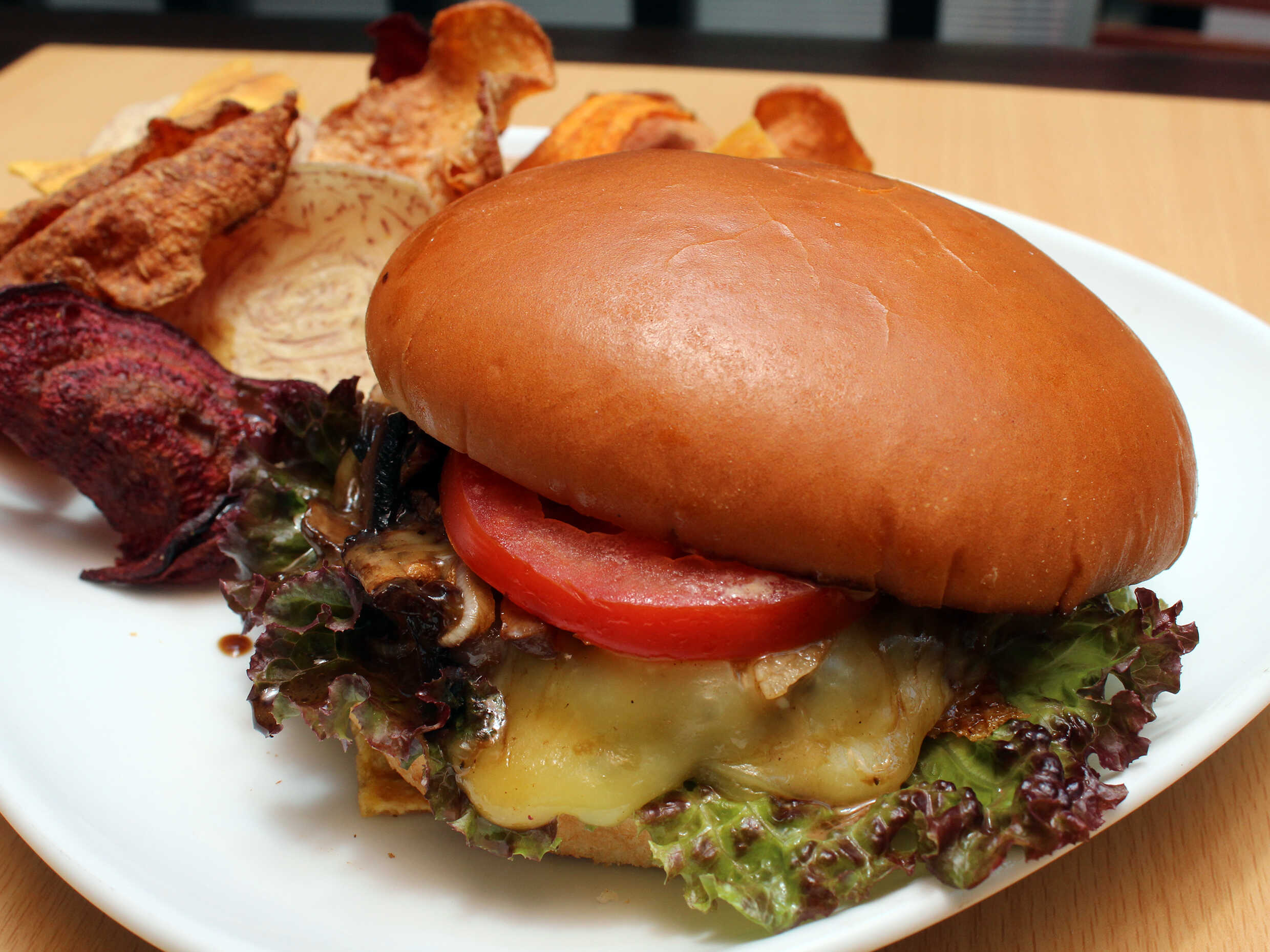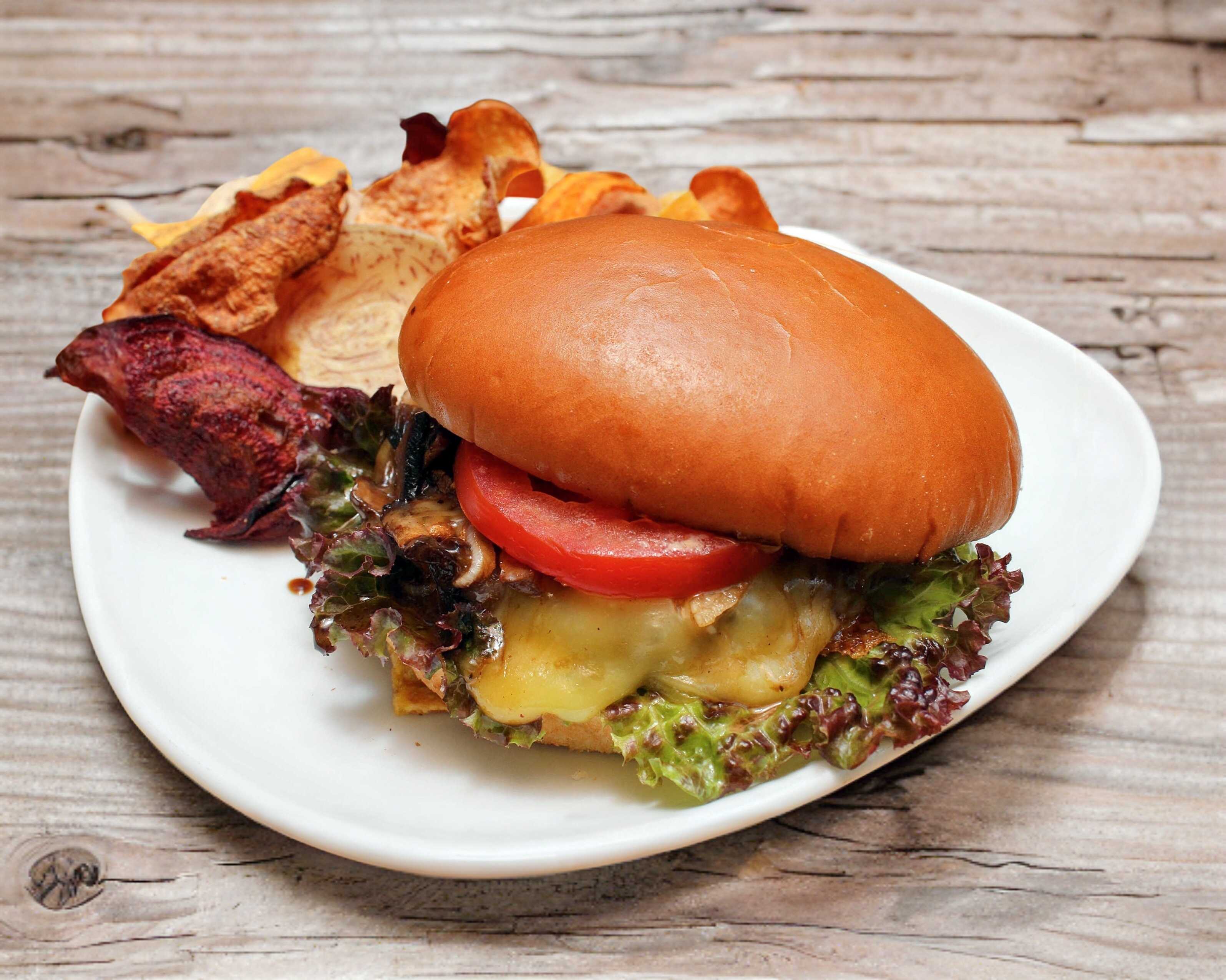 Carne molida con queso manchego, cebolla y champiñones caramelizados en balsámico, lechuga, jitomate y cebolla.