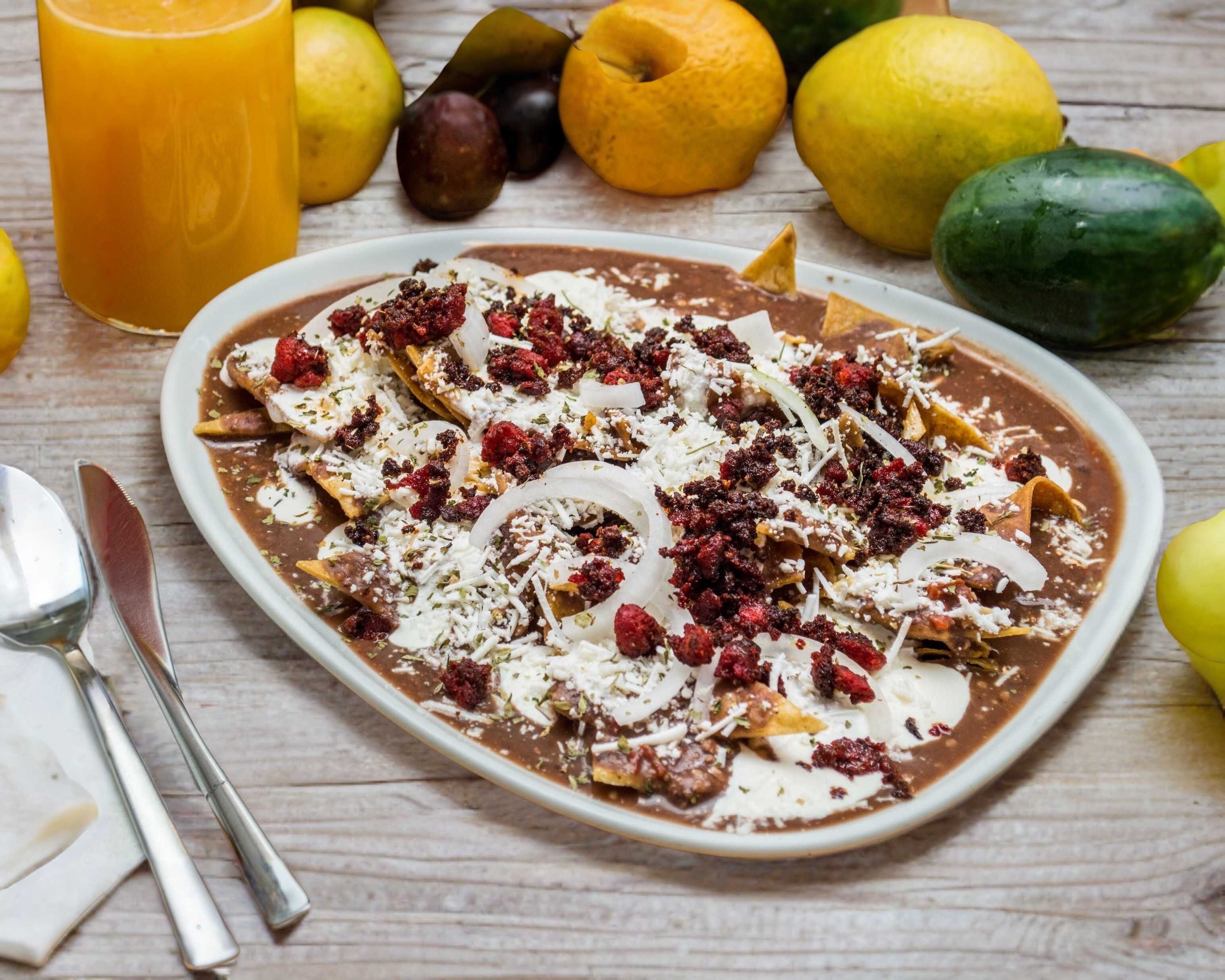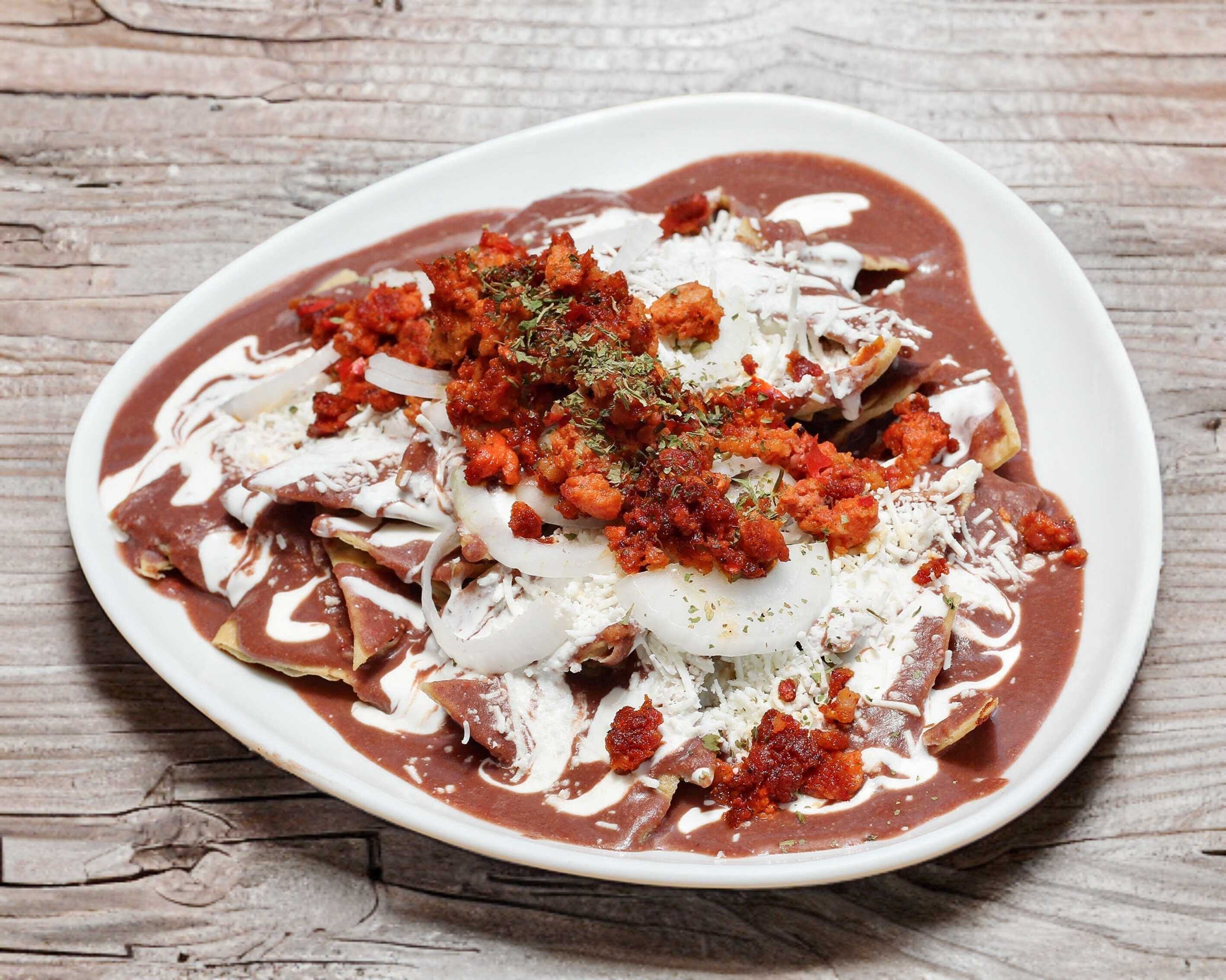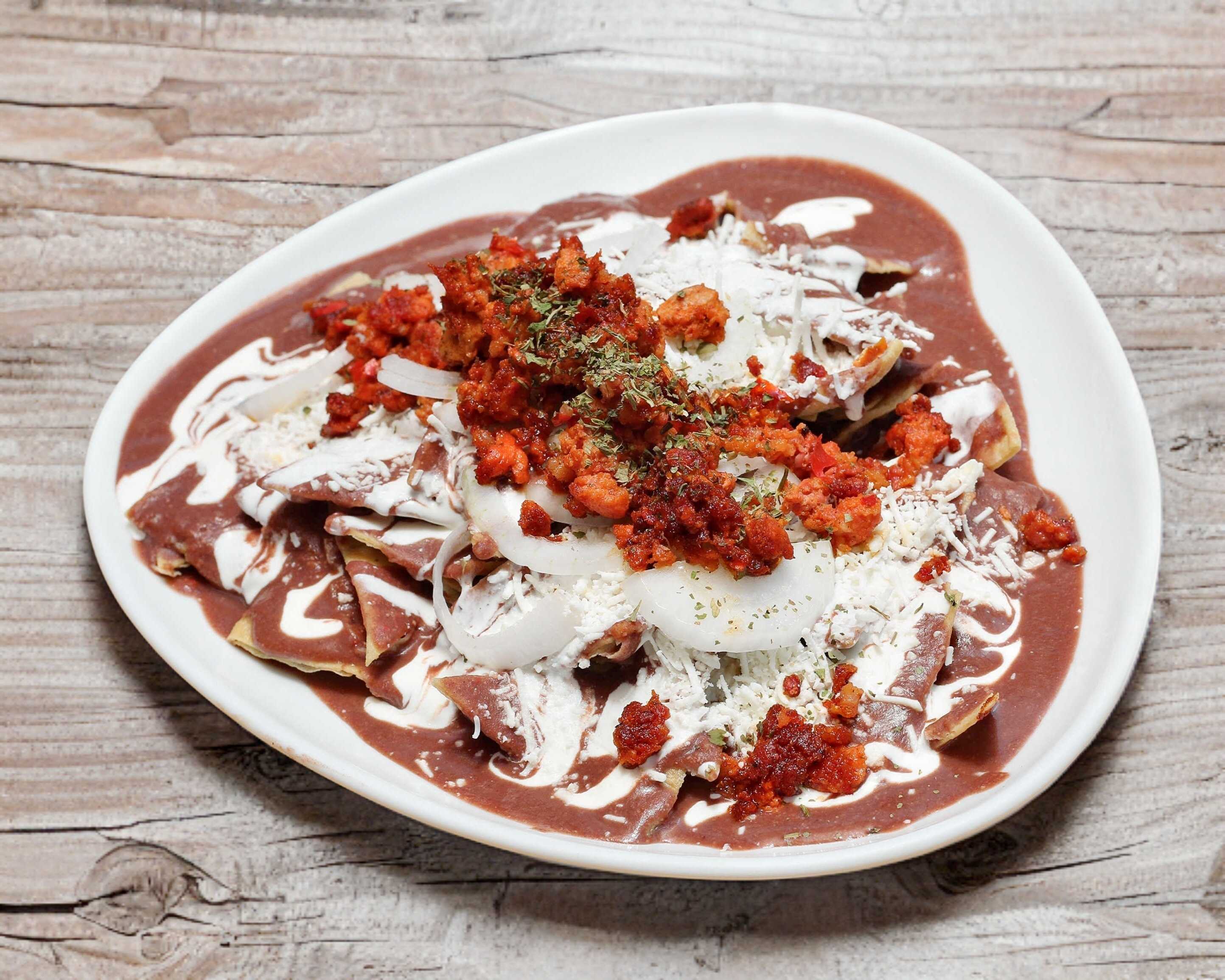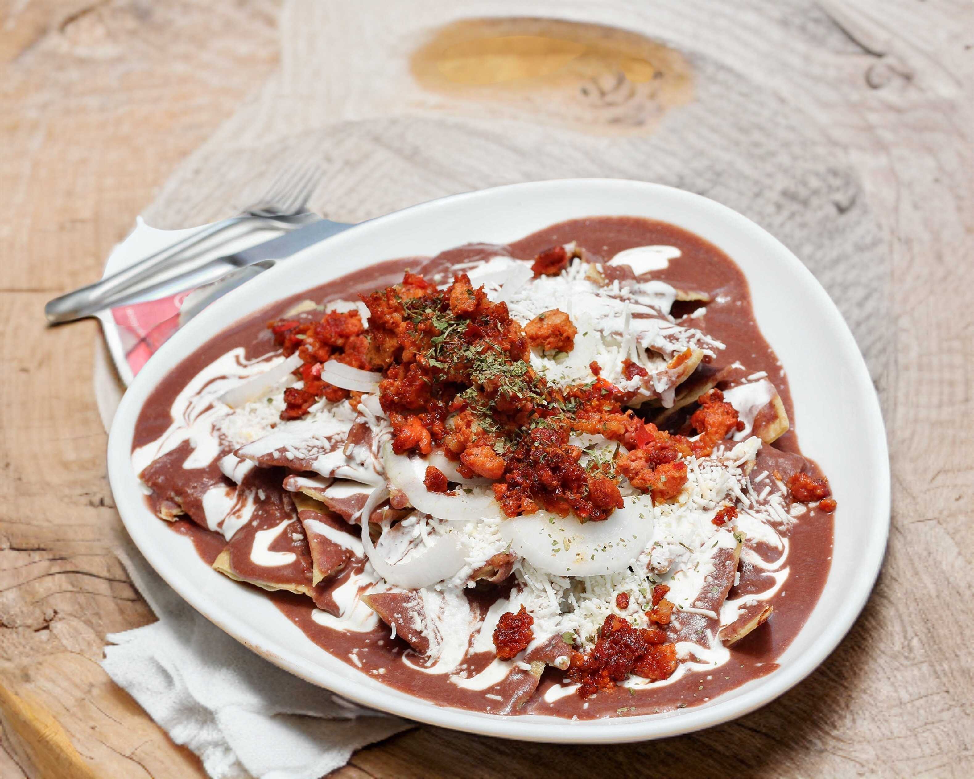 Chilaquiles con salsa de frijol, con chile morita y nuez. NO TRAEN PROTEINA