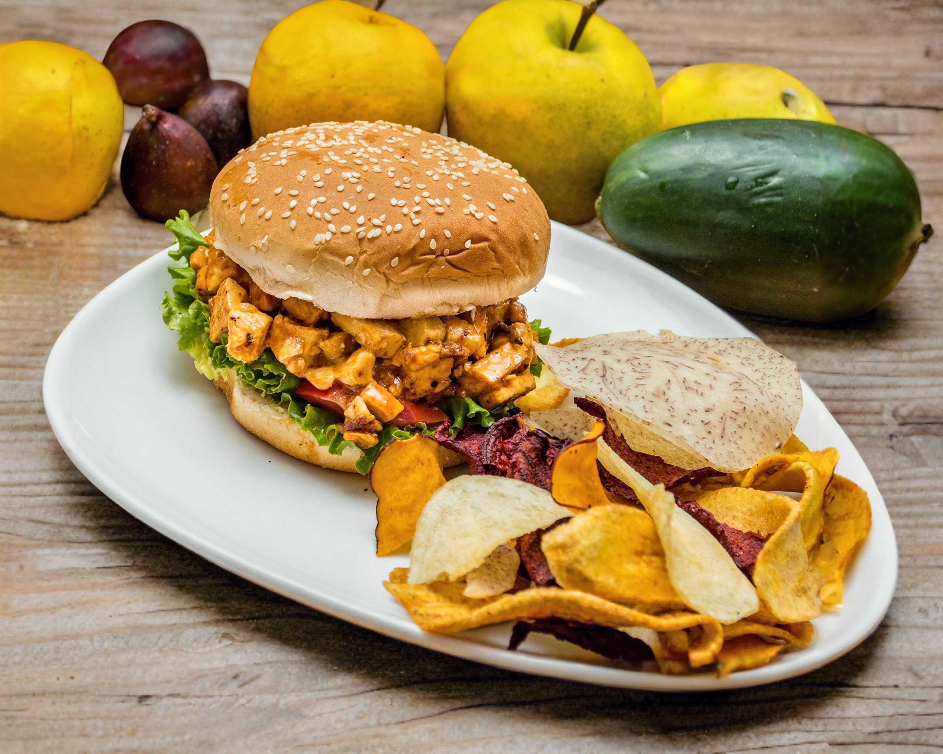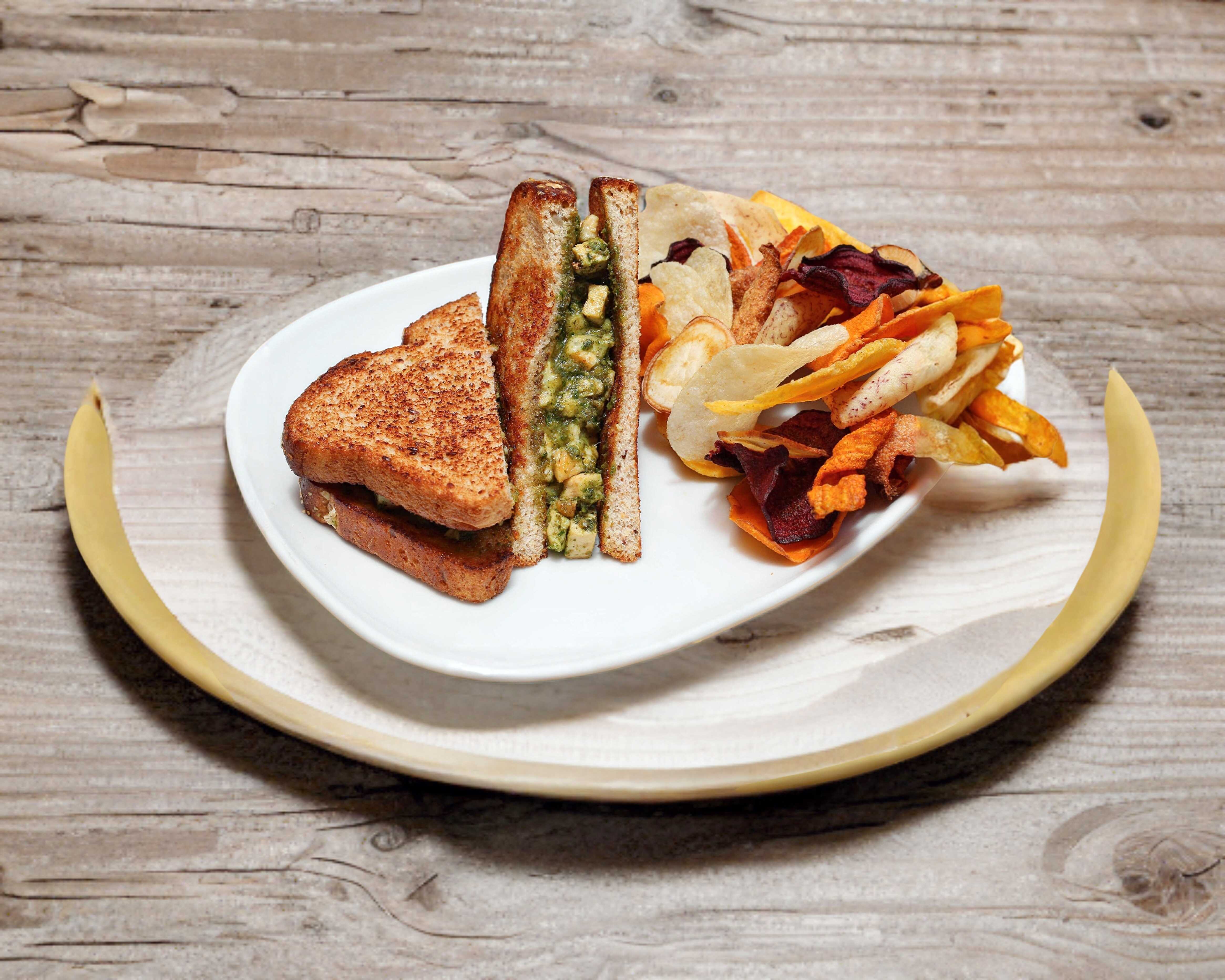 Pollo marinado al pesto con queso manchego en pan de 12 granos.