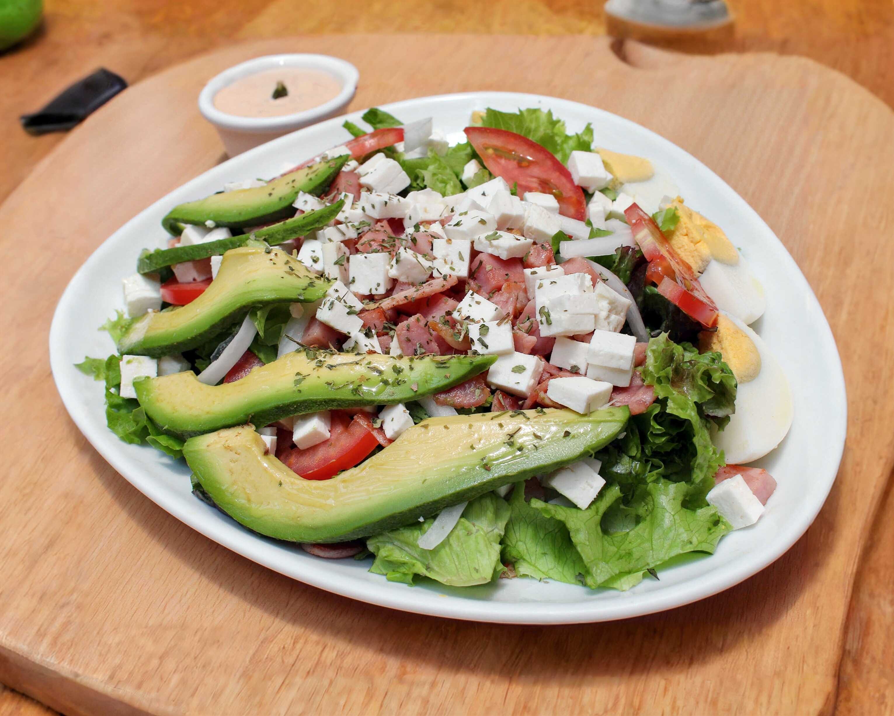 Lechuga, jitomate, cebolla, aguacate, jamón, tocineta, huevo cocido, queso panela y aderezo de mil islas casero.