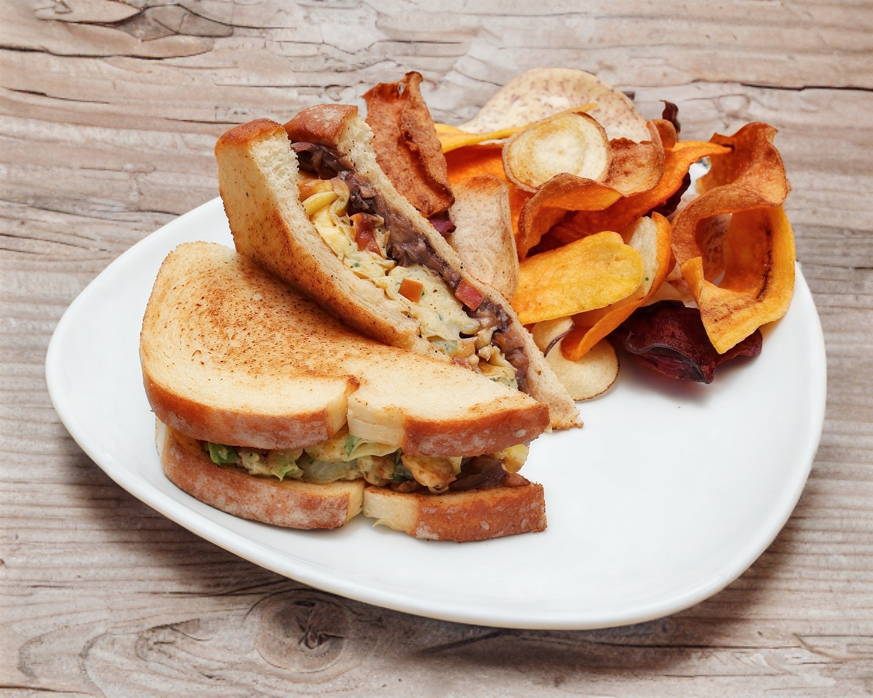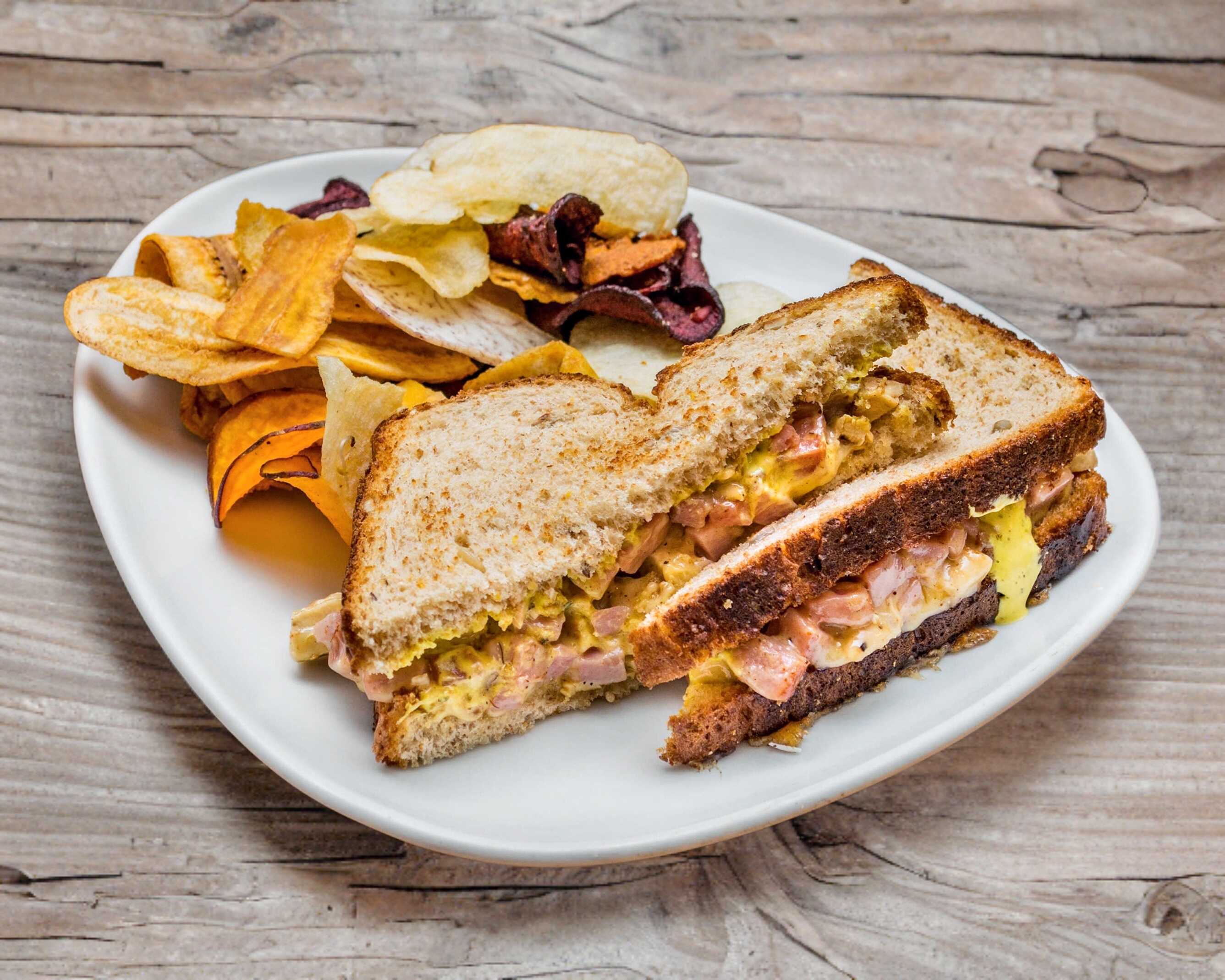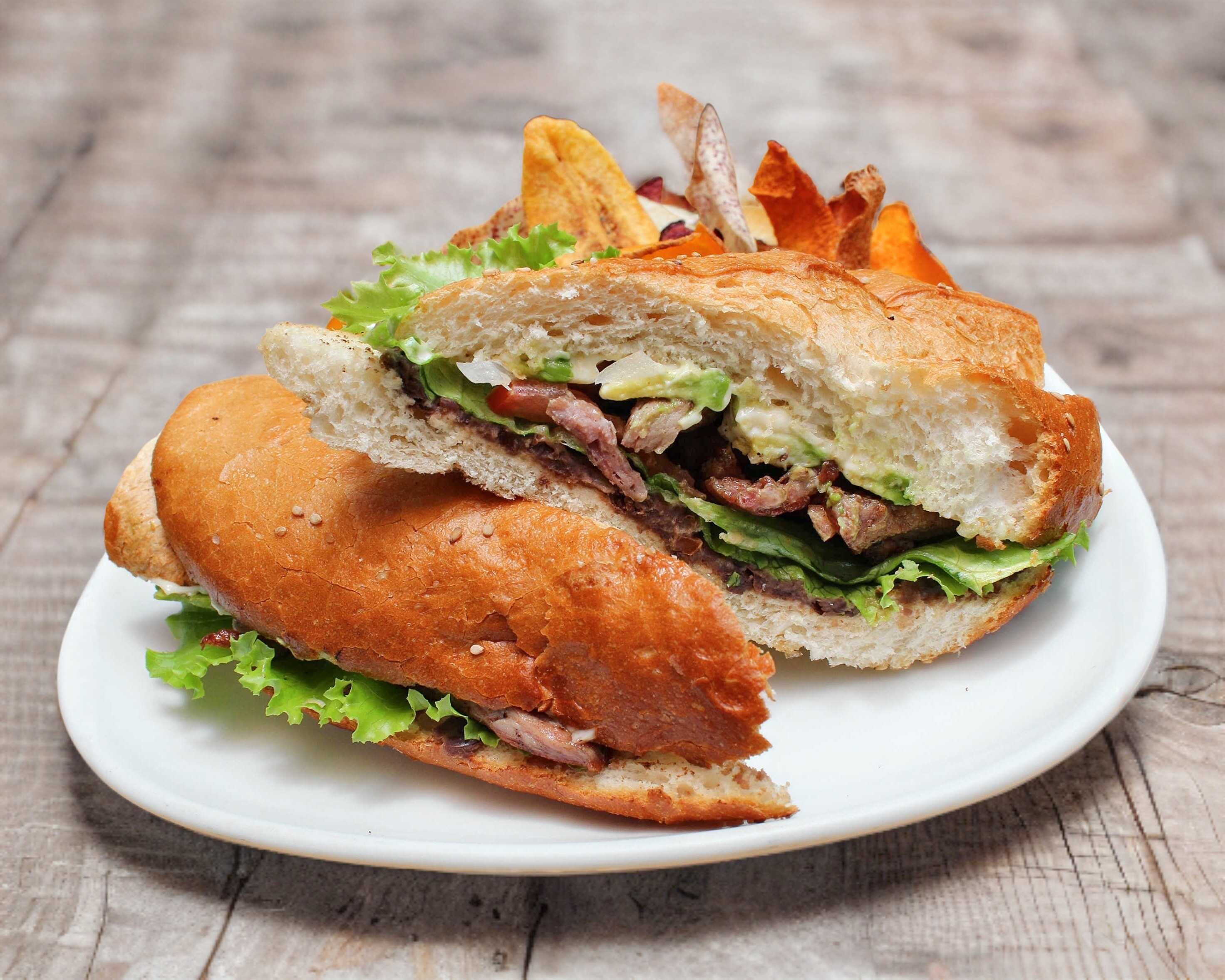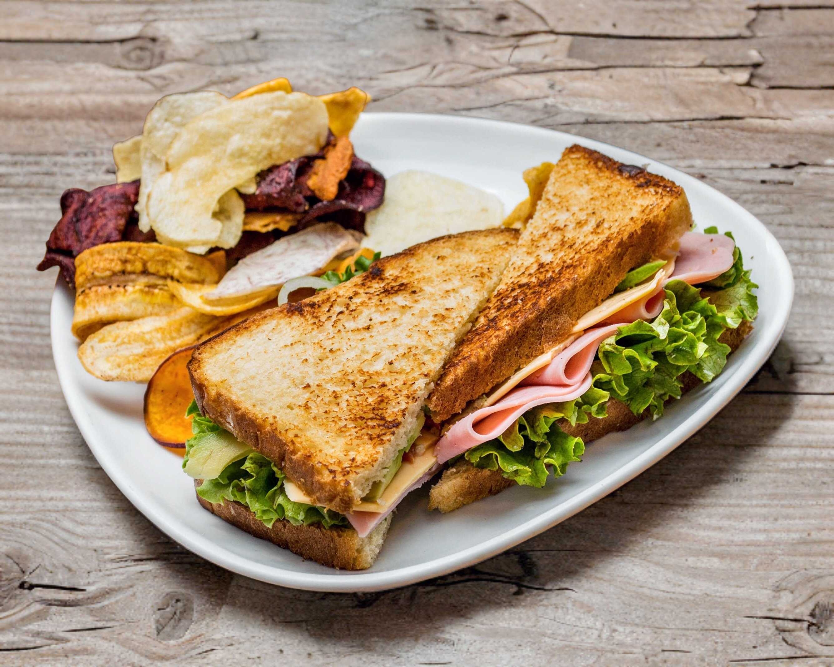 Pan integral con pollo, tocineta y jamón con aderezo de mayonesa-mostaza y queso manchego.
